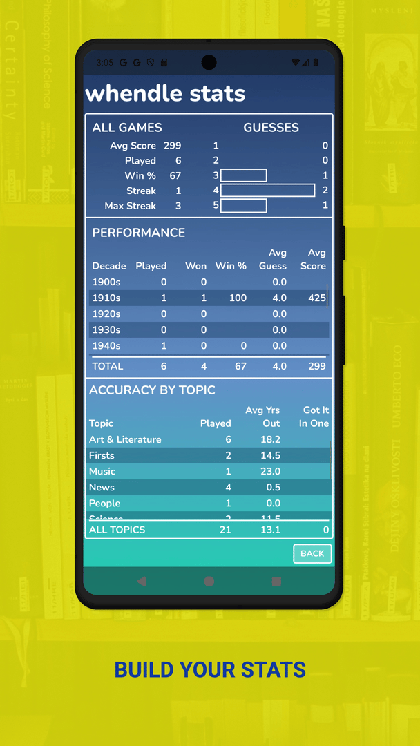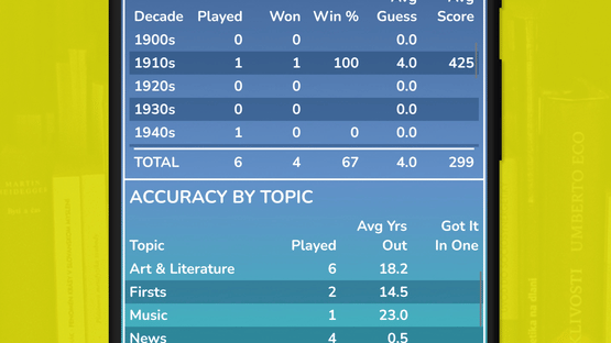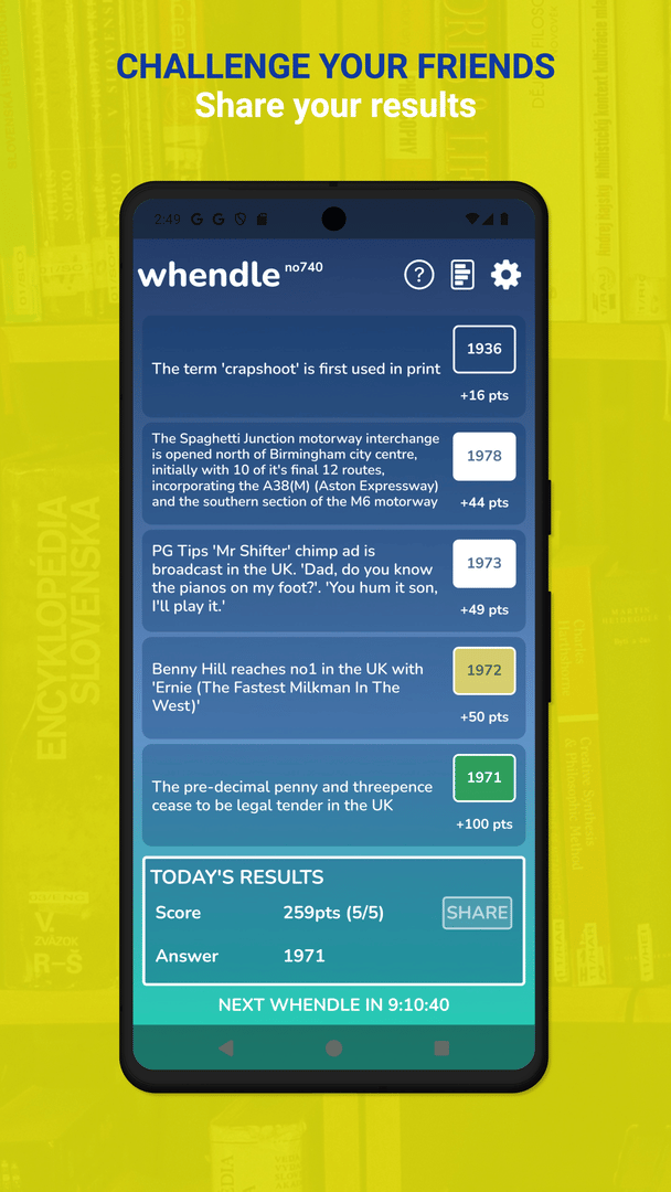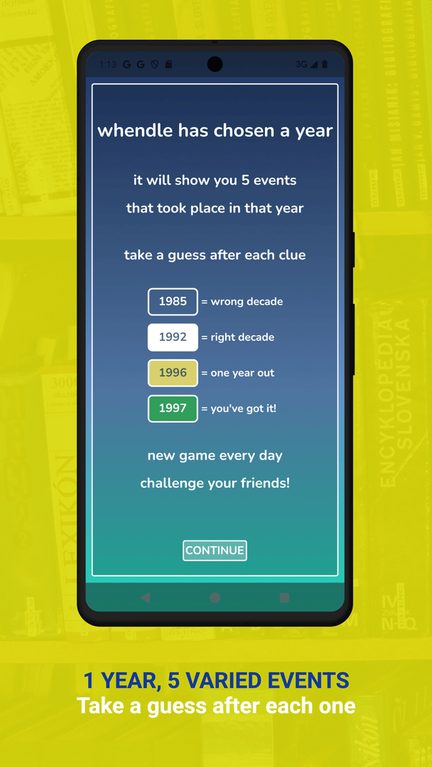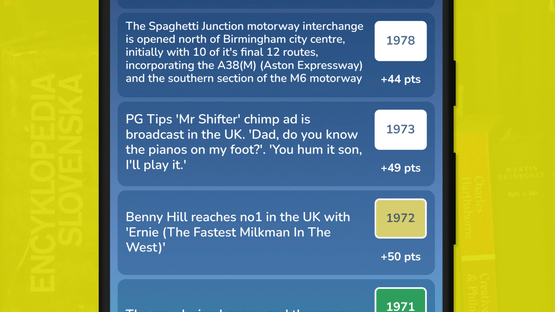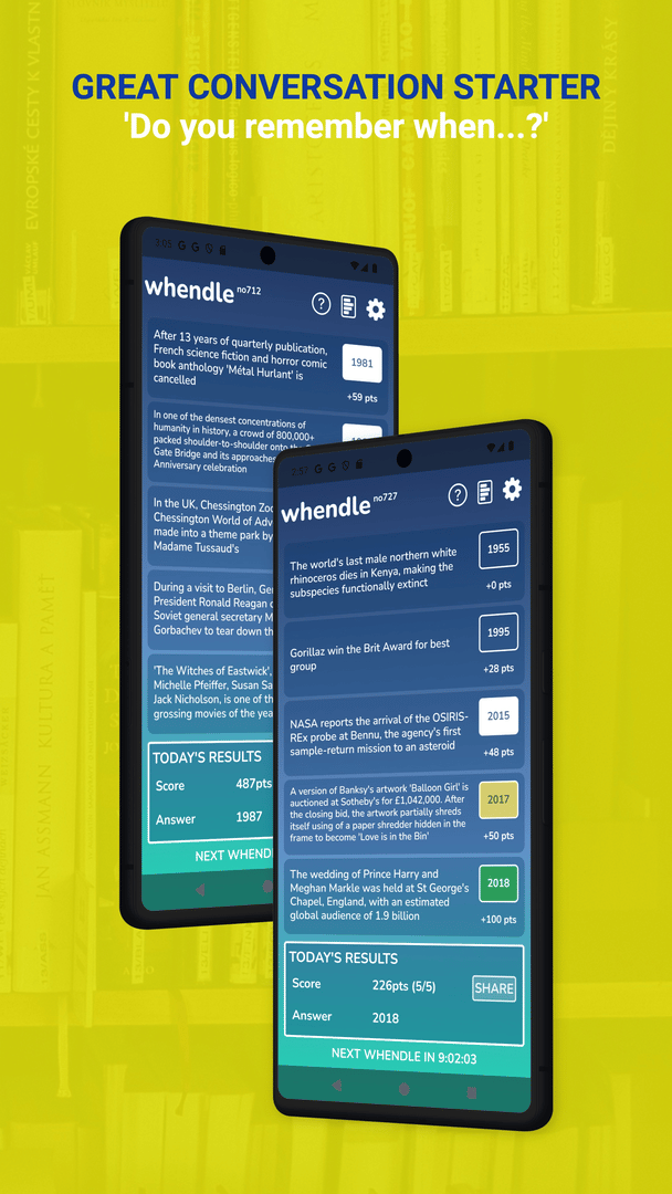 A daily 'guess the year' puzzle game where players have to find the single year in which 5 events took place. The events are presented one at a time, obscure ones to start with, but becoming more well known, allowing the player to use knowledge or deduction to guess a year after each one. The game gives feedback on how close each guess was. After quiz the player can share their final score and a 'Wordle-style' results grid with friends to challenge their friends. It also keeps full statistics on their performance.
