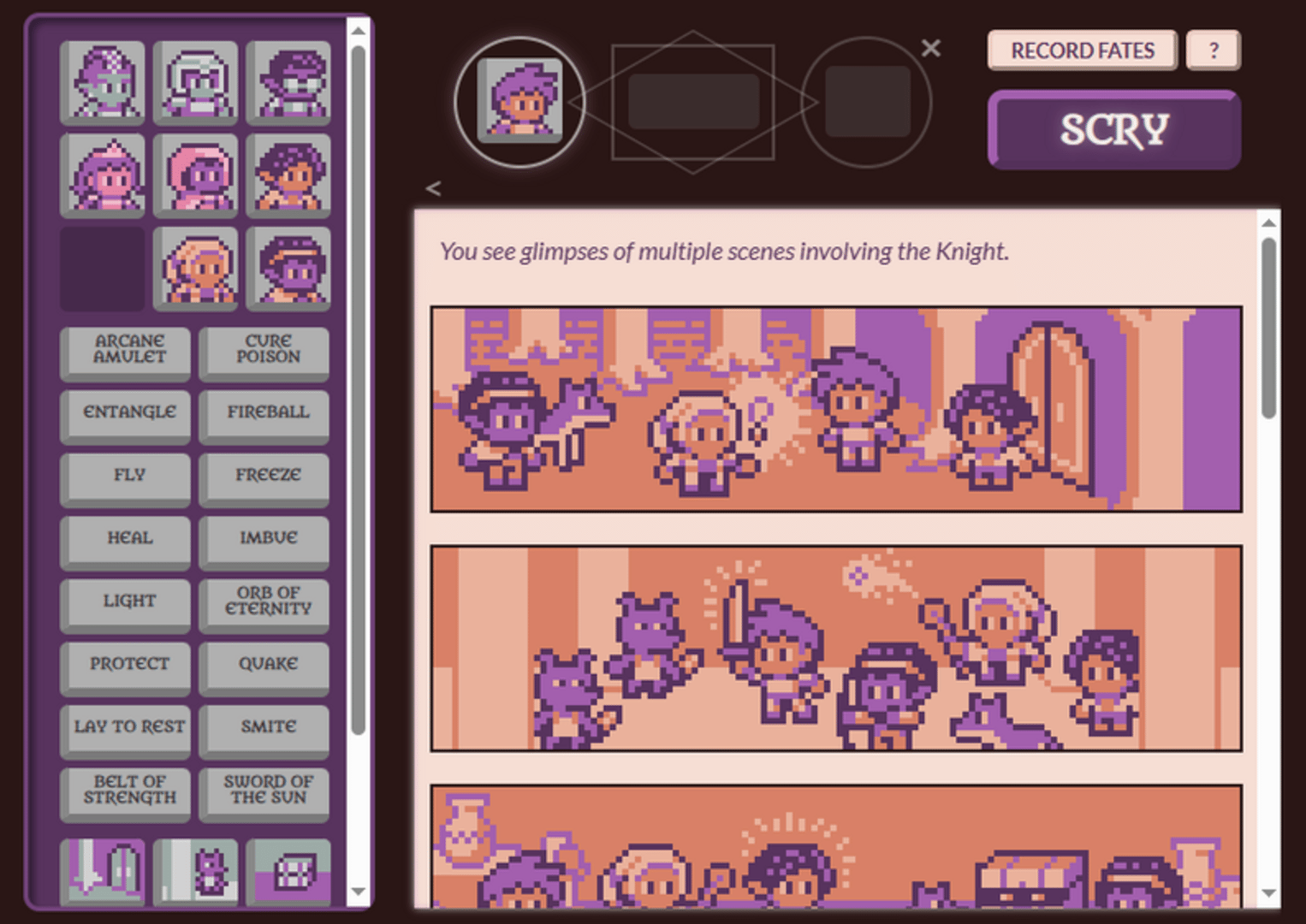 The princess has disappeared in the dungeon! Scry on magical events to deduce what spells were cast when, piece together the stories of multiple adventurers, and uncover the princess’s fate. Inspired by games like Type Help, The Roottrees Are Dead, and Her Story.