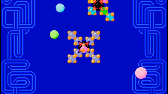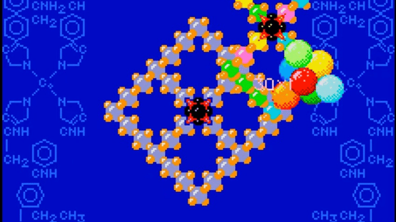 The player must take control of the Chemic, a small black atom with red spikes which must adhere itself to passing Moleks (which come in four different colours: cyan, green, pink and yellow) in order to duplicate the patterns shown in the centre of the screen; if a Molek adheres itself to the Chemic incorrectly, the player must press the reject button to throw it away. The singular enemy in the game is the Atomic, a malevolent clump of balls which moves randomly around the screen, and will kill the Chemic if it merely touches it - however, the Chemic can counter-attack by adhering itself to a Power Molek (which are slightly larger than the regular Moleks, and first appear in the game's second world: once the Chemic has adhered itself to one, the adhered Moleks will spin around rapidly, and their speed will decrease to denote the nearing of the Power Molek's ending time limit). But the Atomic has a nasty habit of splitting up and reforming in order to cover more ground, and even the Power Moleks cannot match up to the Atomic's deadly Alpha- and Beta-Rays which can instantly cause them to float away (along with the regular Moleks) on contact; there are total of eighteen unique patterns which must be duplicated in the game, and every fourth stage is a "challenging stage" where the Chemic can fire yellow Moleks in four directions at the Atomic.