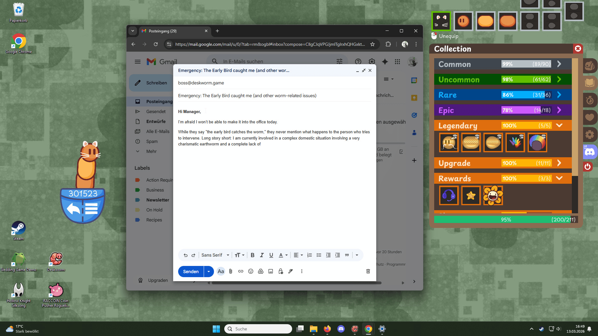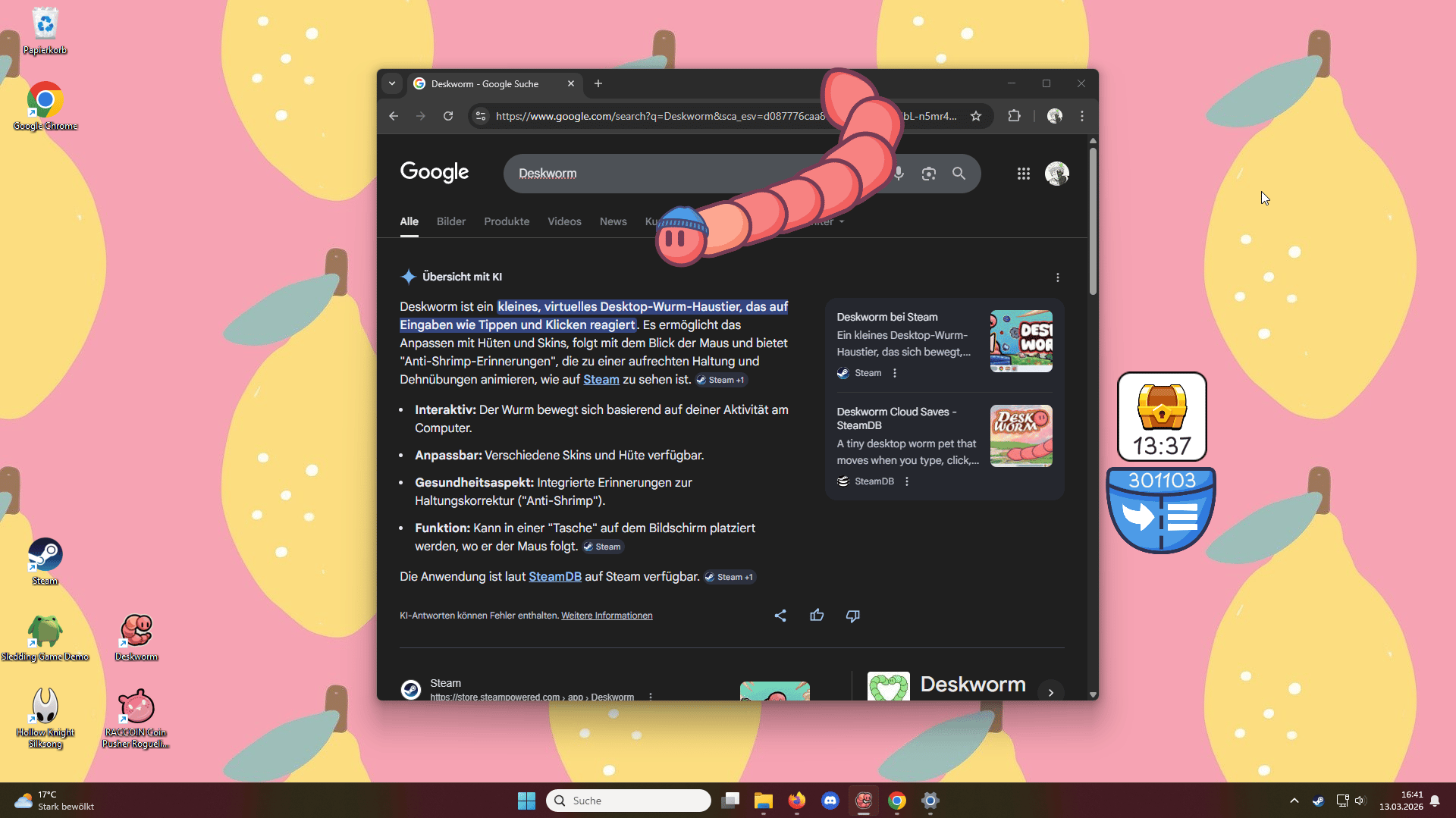 A tiny desktop worm pet that moves when you type, click, or play. Dress it up with hats and skins, park it in a pocket where its gaze follows your mouse, and let its Anti-Shrimp reminders nudge you to sit up and stretch.