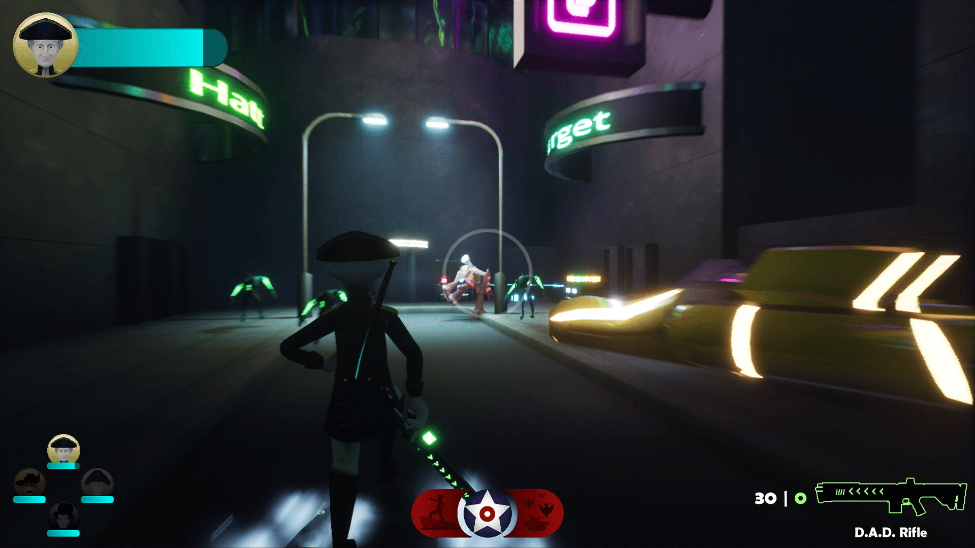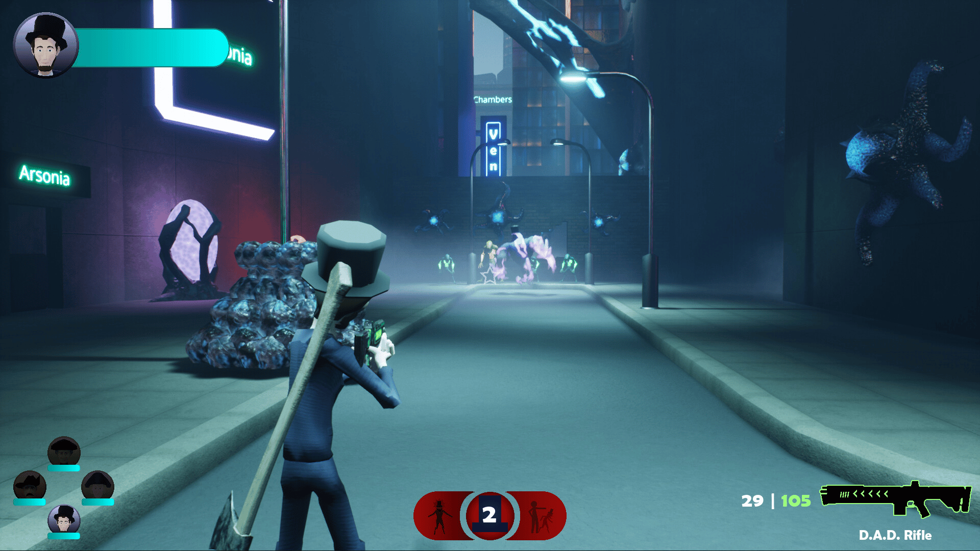 Rushmore is a third-person, hero-focused, shooter/hack-n-slash hybrid. You play as the four Presidents of Mount Rushmore sucked into the future to face off against alien hordes with weapons and abilities inspired by American history.