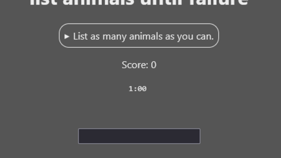 Animals must have Wikipedia articles. You have limited time, but get more time for each animal listed. When the timer runs out, that's game over. No overlapping terms. For example, if you list “bear” and “polar bear”, you get no point (or time bonus) for the latter. But you can still get a point for a second kind of bear. Order doesn't matter.
