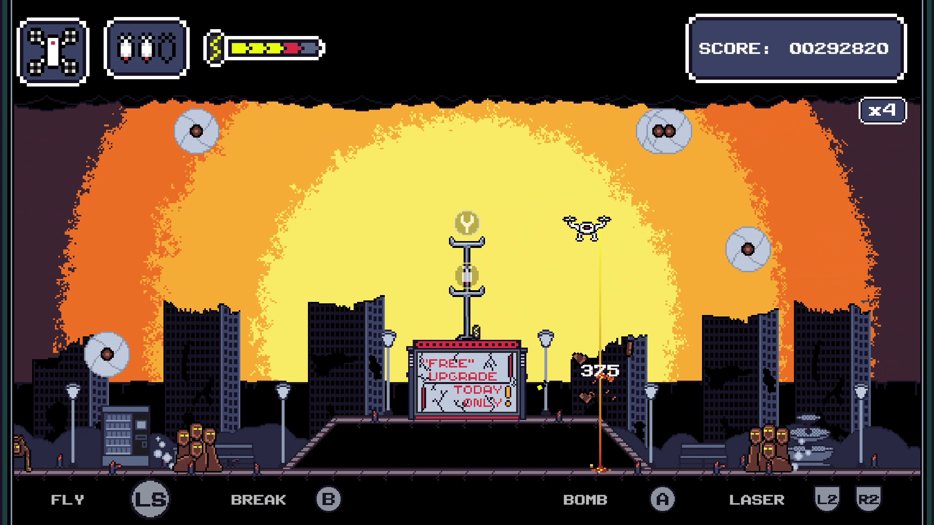 An old-school arcade where a single drone is humanity's last chance against robot uprising. Drop the bombs, fire your lasers, destroy robots and protect humanity.