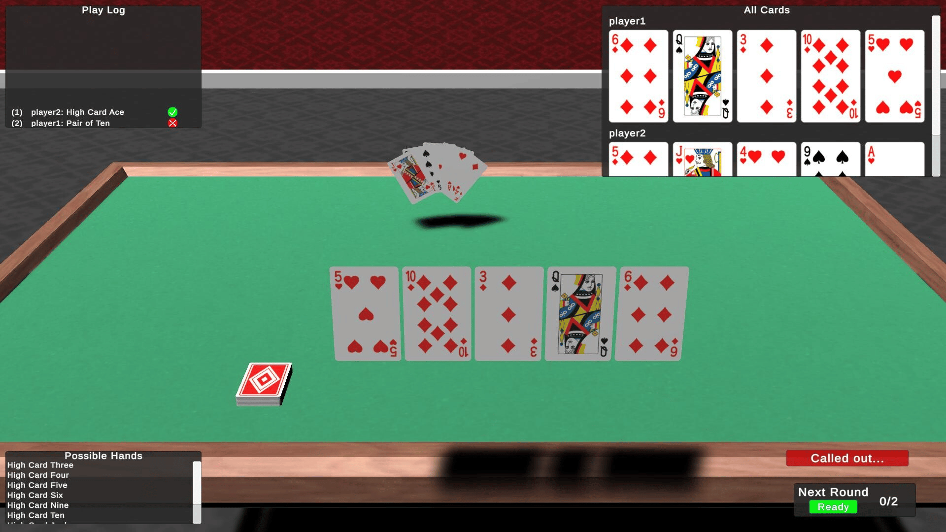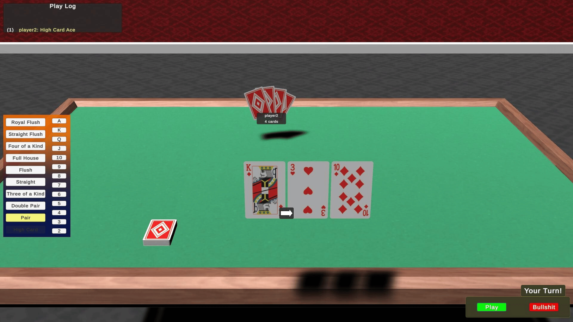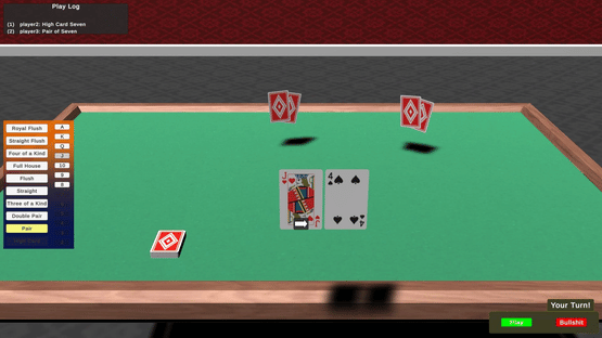 Turn-based card game. Raise the bar on the best poker hands you think are present out of all players' cards. Since you can only see your cards, you'll have to take a chance on the cards other players have or lie about your own cards. Bullshit or be bullshit-ed.