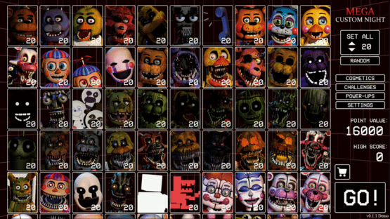 Mega Custom Night is an Ultimate Custom Night fangame built from the ground up without reusing any original code from the base game. Featuring 80 unique animatronics spanning the first 6 games in the franchise, each with completely original and innovative mechanics.