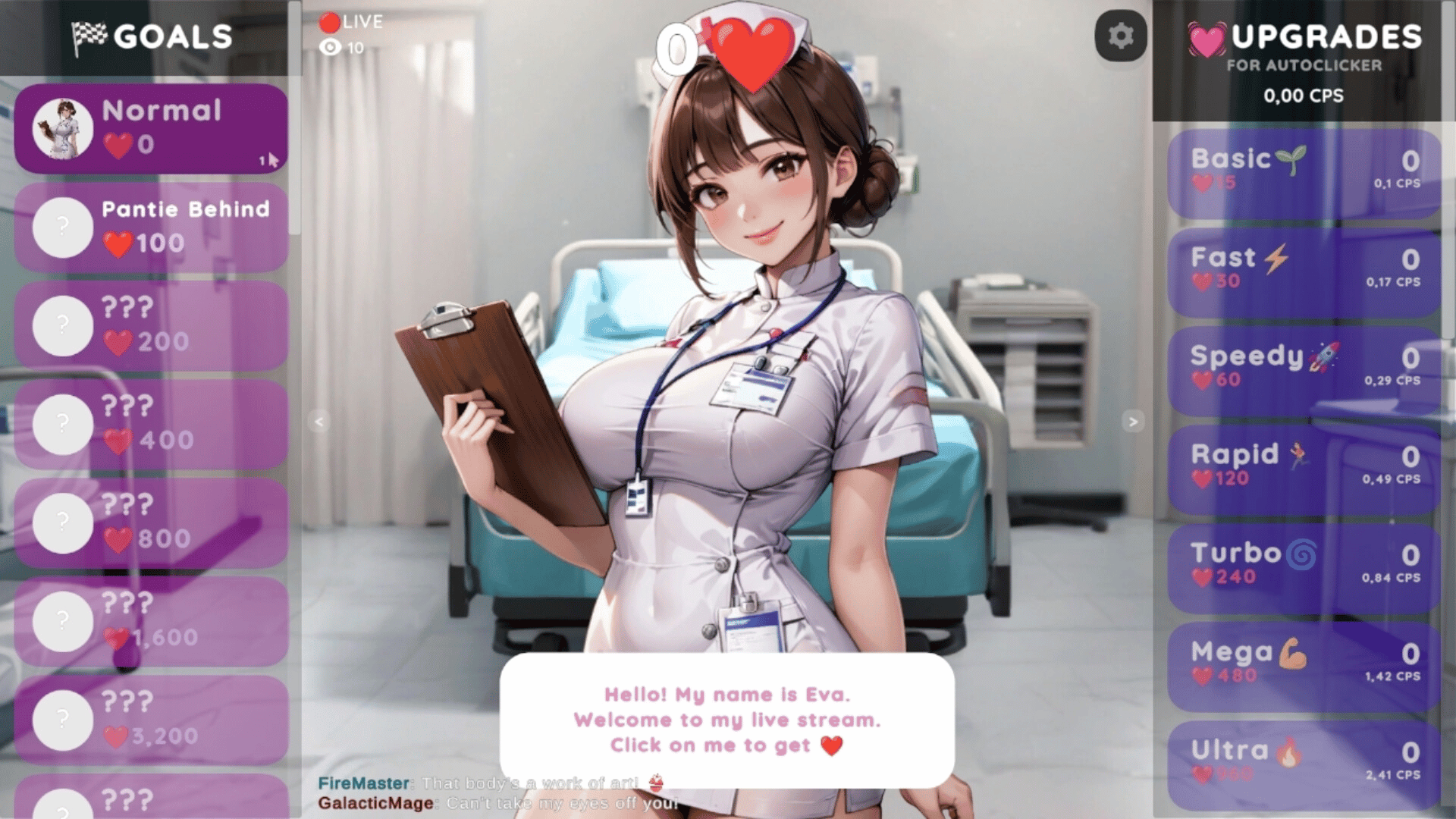 Let Nurse Eva take care of you in Hentai Clicker: Eva is streaming! Click to collect ❤️, unlock sexy nurse outfits, and enjoy explicit scenes with your irresistible brunette caregiver!