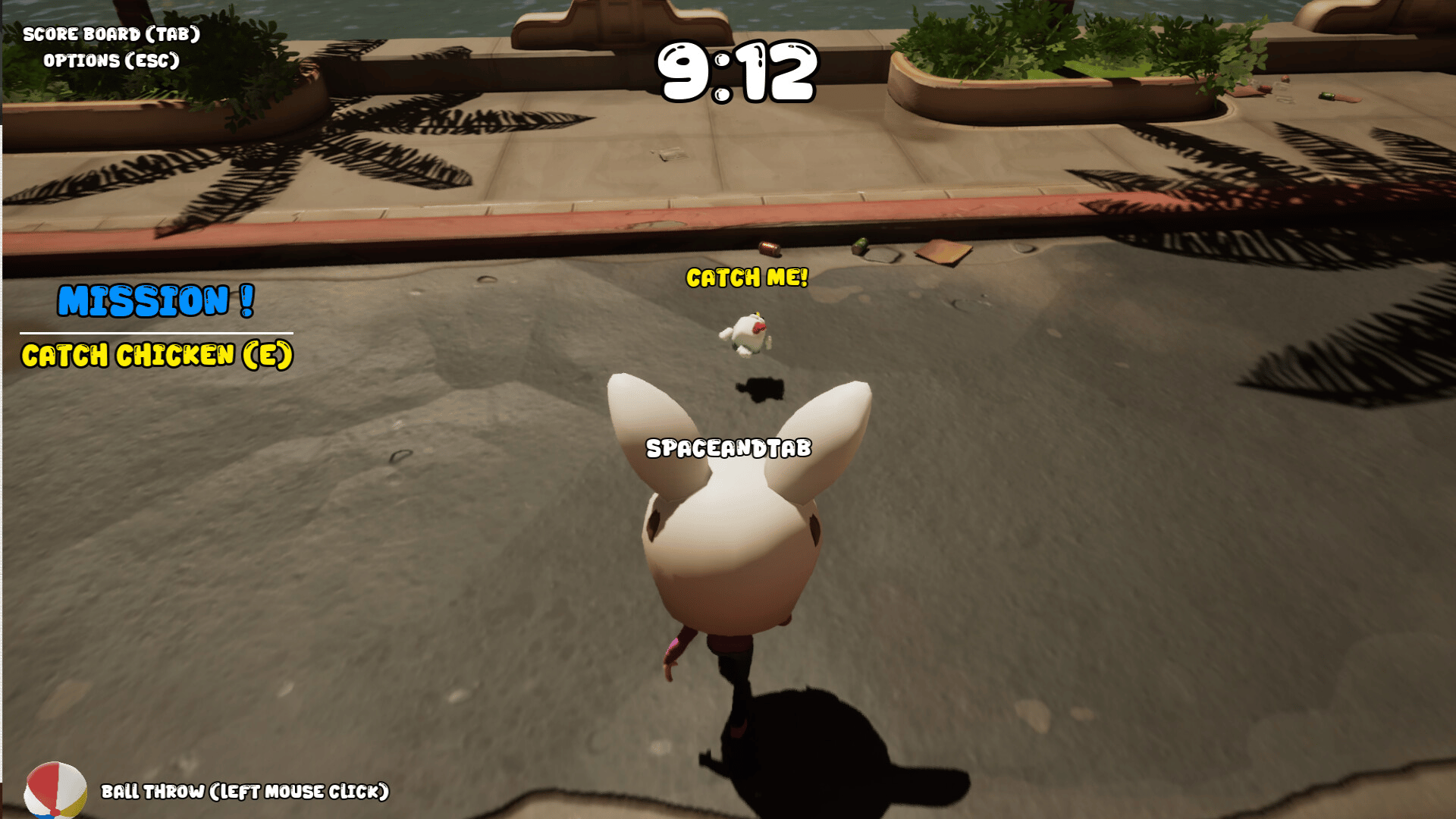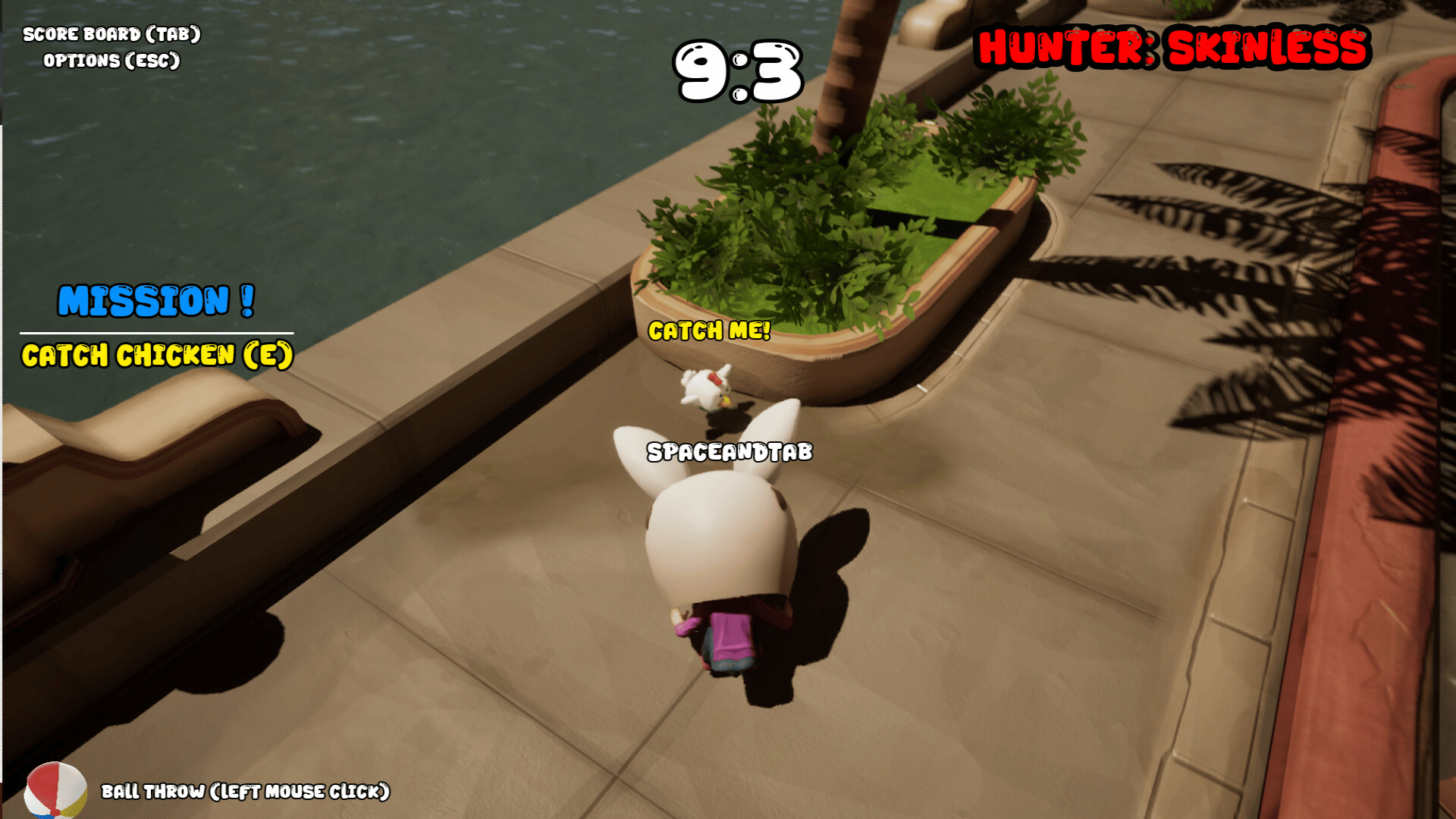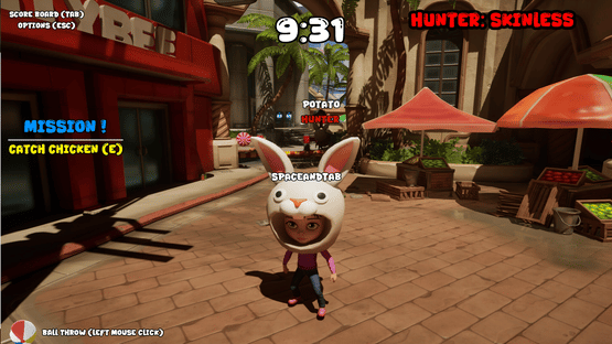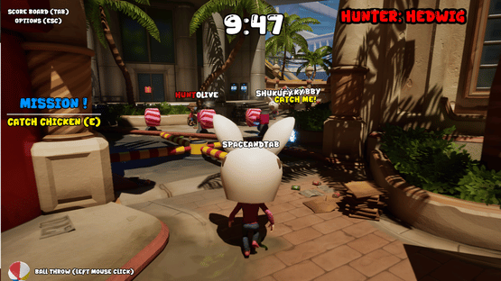 Catch roaming chickens across the map, deliver them, and rack up points! If you aren't Hunter, throw beach balls at rivals to make them drop their loot; if you are Hunter, focus solely on the chase. In this chaotic pursuit played against friends or smart bots, the highest score wins!