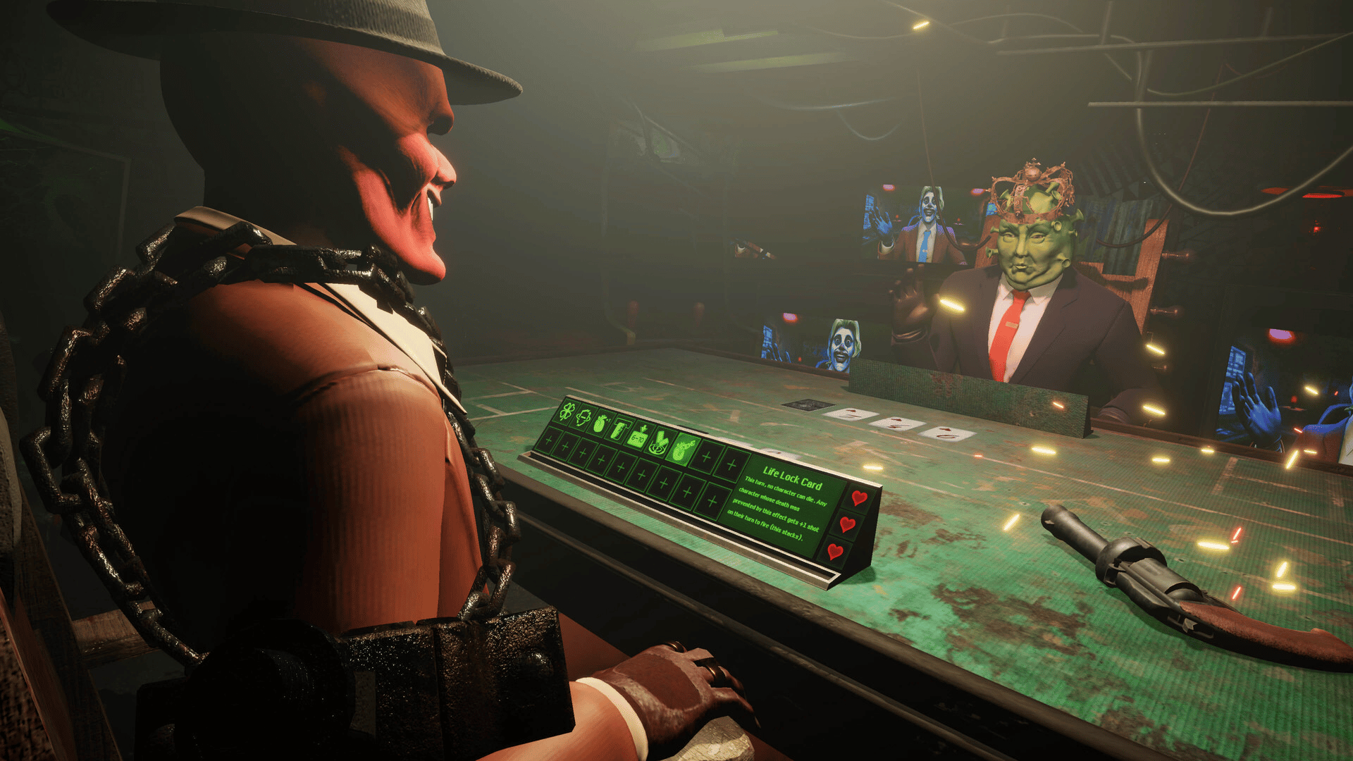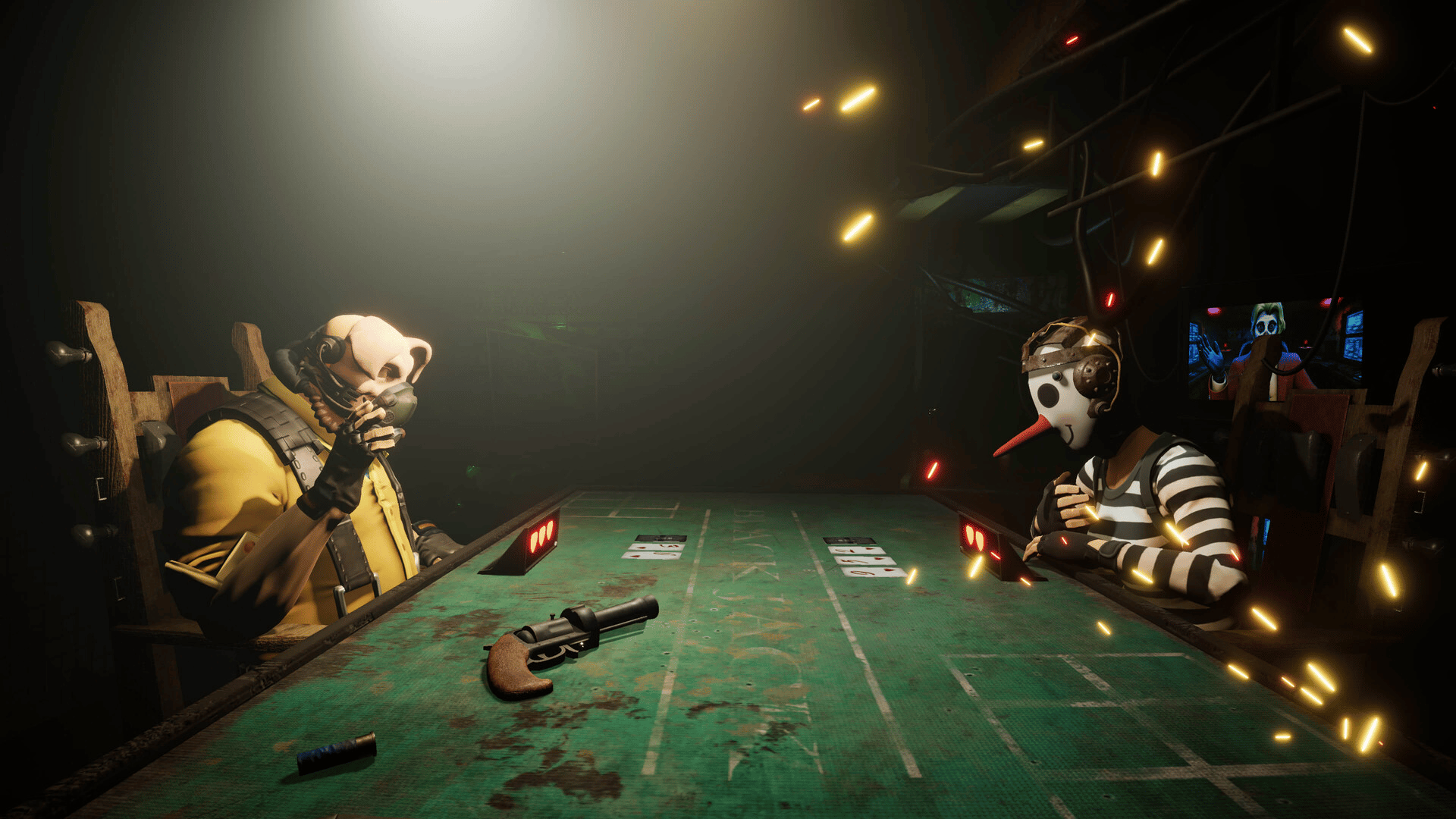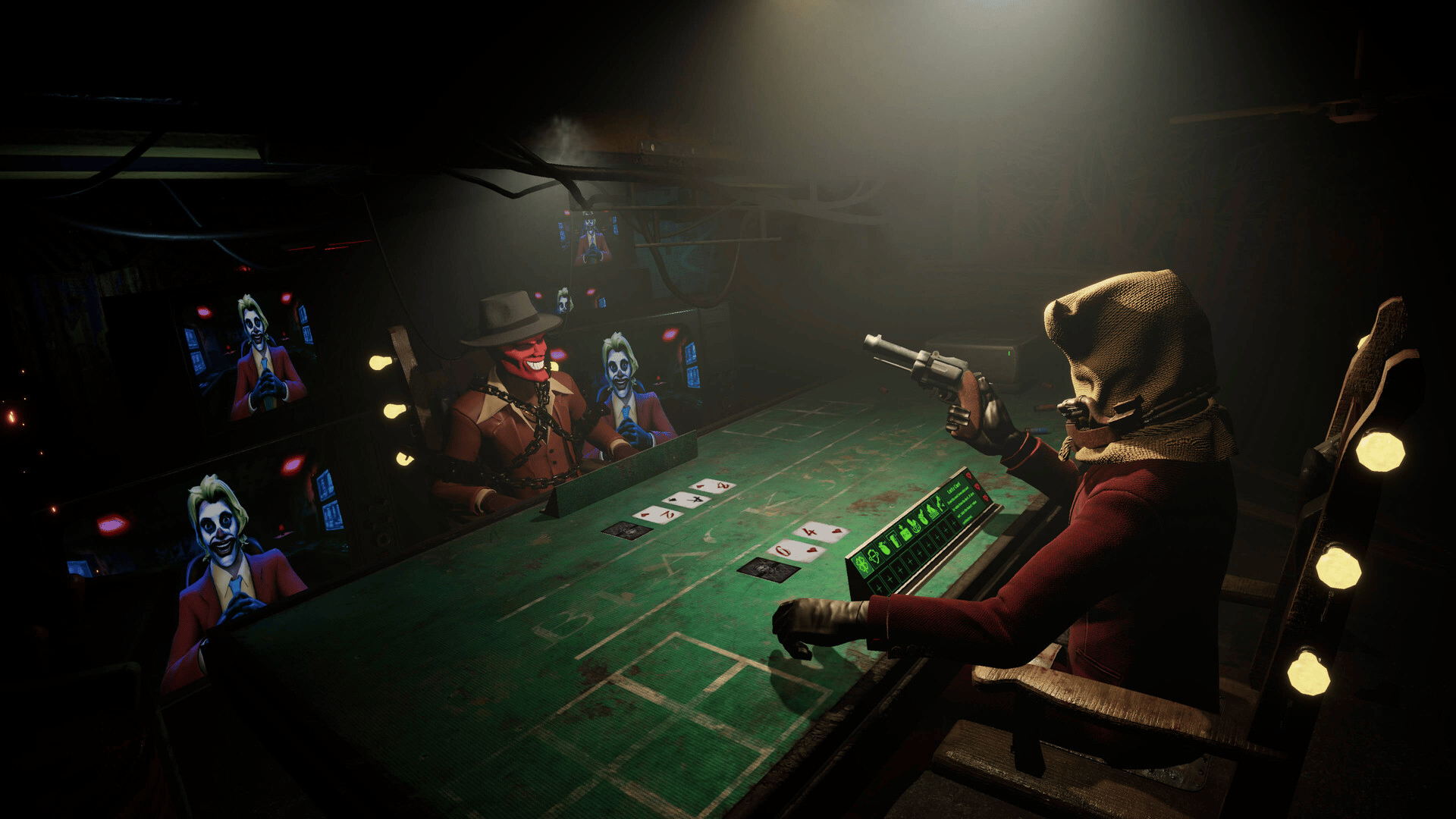 Blackjack meets roulette in a deadly duel. Lose a hand, pull the trigger. Use powerful cards to outsmart opponents in 1v1 battles, or defeat the Clown to escape. Win or die.