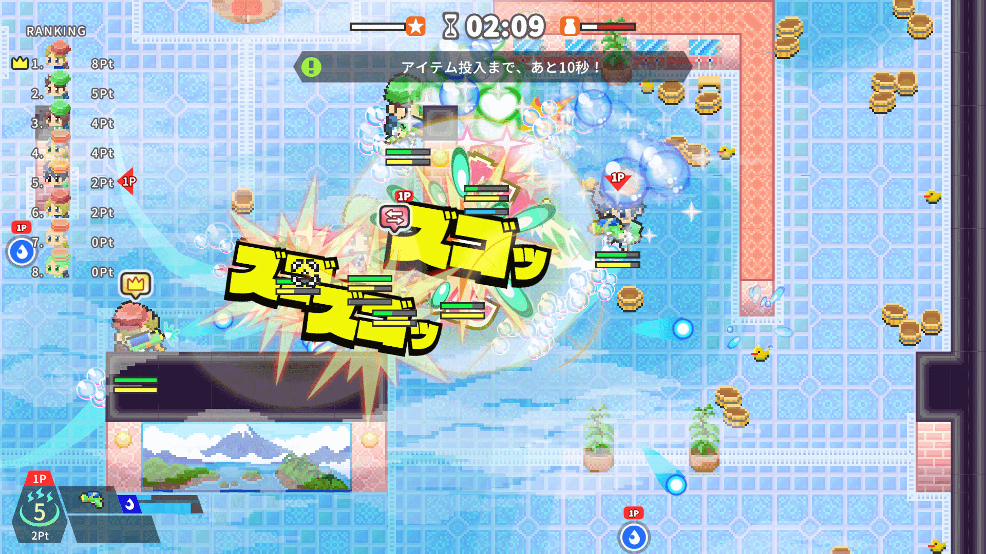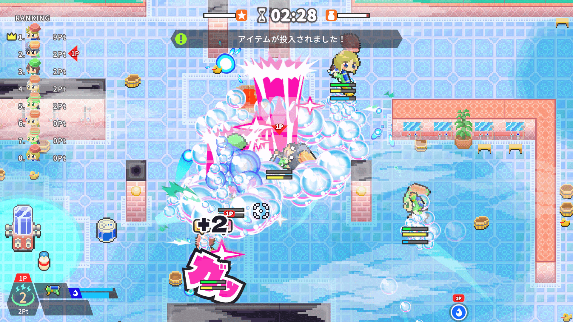 Slide, Shoot, and Send Your Rivals Flying!Chaotic, tumbling shooter battle set in a Japanese Sento (public bathhouse). On these super slippery floors, you'll slide, shoot, and stumble to victory. Defeat your rivals and soak in the sublime bath reserved only for the winner!
