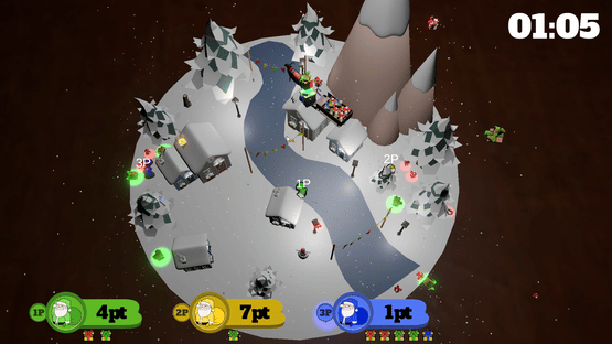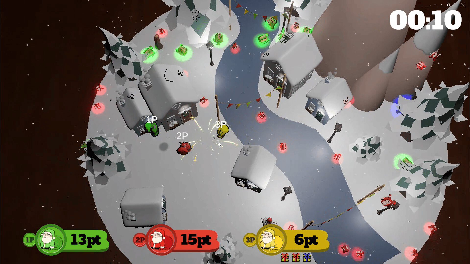 King of Santa is a competitive party action game for up to four players, where players take on the role of Santa, collect presents scattered across the stage, and deliver them to chimneys to earn points and win the match.