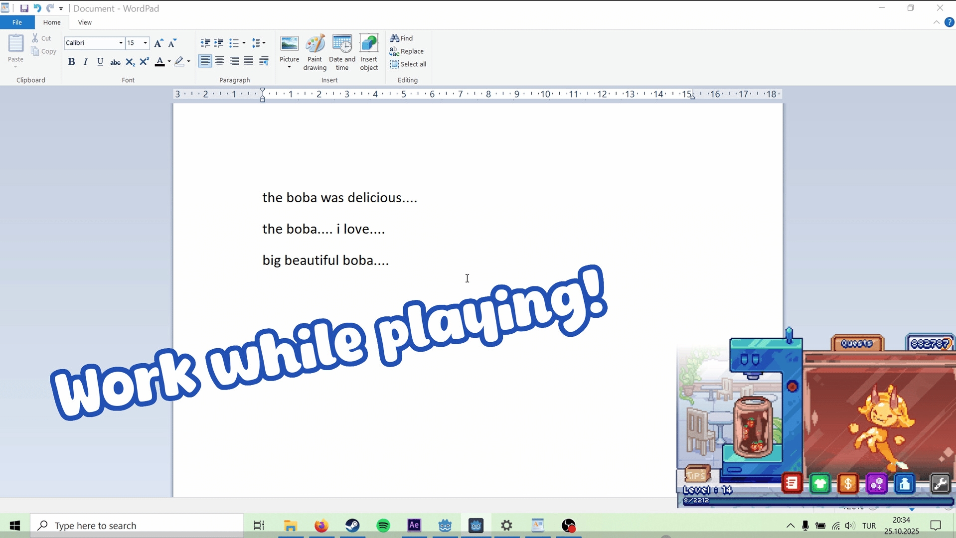 A relaxing, idle boba-shop simulator that can accompany you as you work on other things. Sell boba tea, unlock new drinks, and customize and care for a boba pet that lives in the corner of your screen!