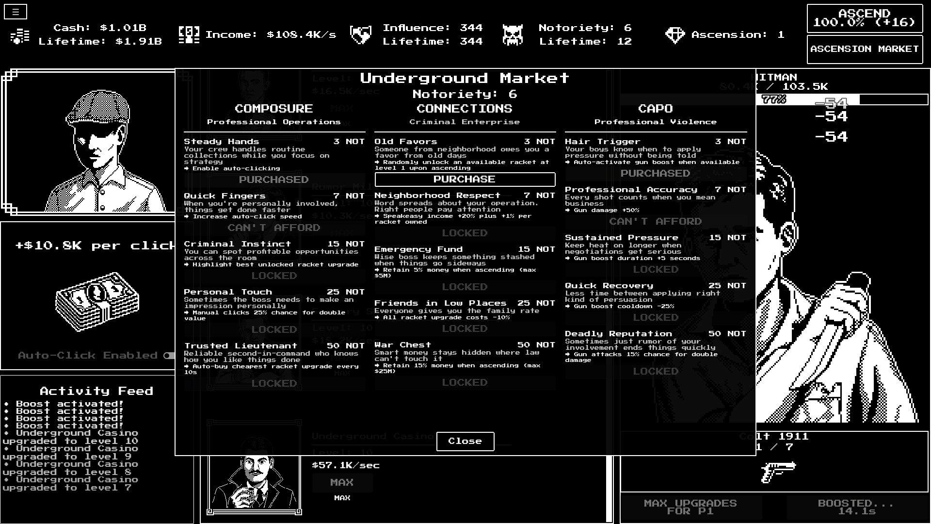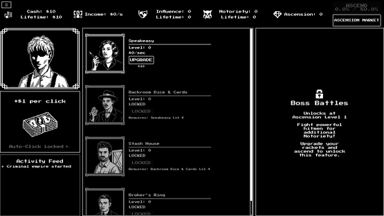 A casual, story-driven incremental game set in 1920s New York. Build your criminal empire from speakeasies to protection rackets, fight rival hitmen, meet colorful characters, and become the city's most powerful crime lord.