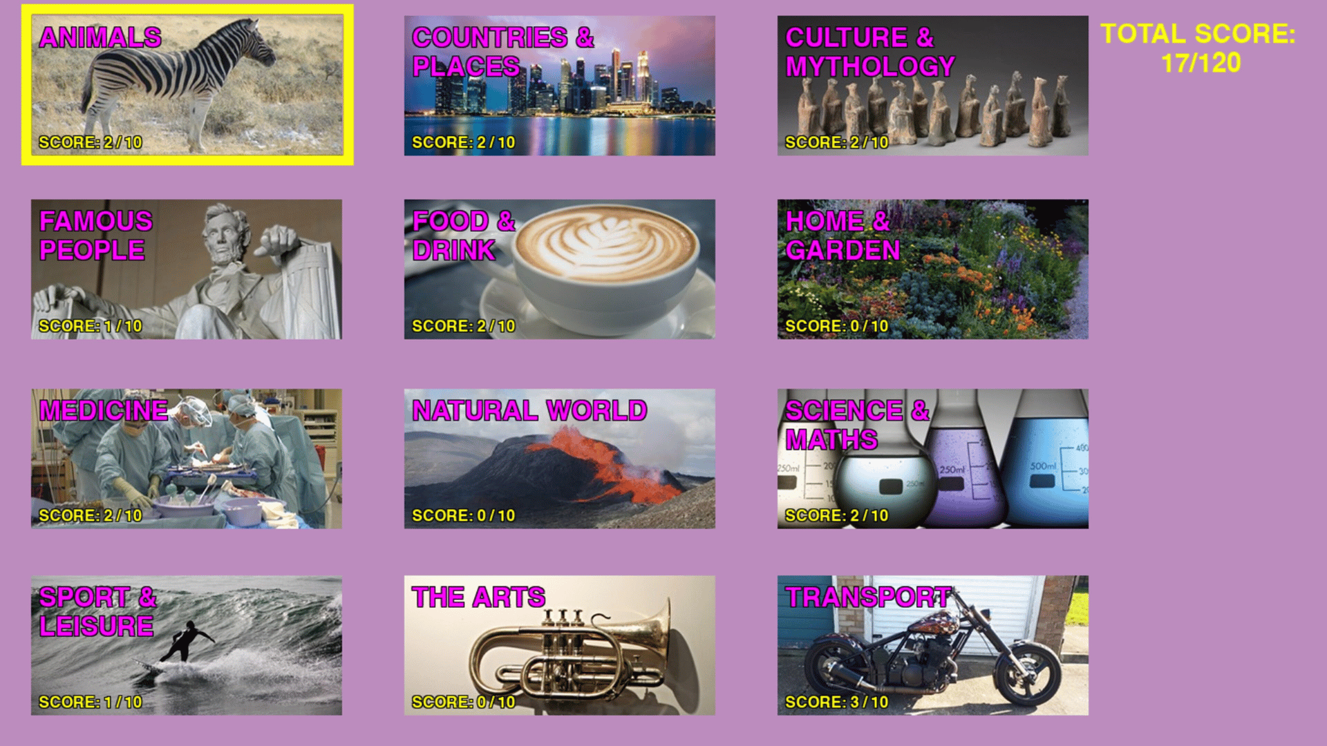Odd One Out 2 is a simple, fun word puzzle game with 12 different subjects that can be selected on the rounds screen (for example Sport & Leisure). Each subject has 10 puzzles and each puzzle is a different category within the overall theme – for instance Water Sports or Famous Racehorses. For each category there are 12 answers on the screen but one does not belong in the category and is the odd one out. Simply find the answer in each category that does not belong. There is no time limit and each subject can be played as many times as you need to reach a great score!
