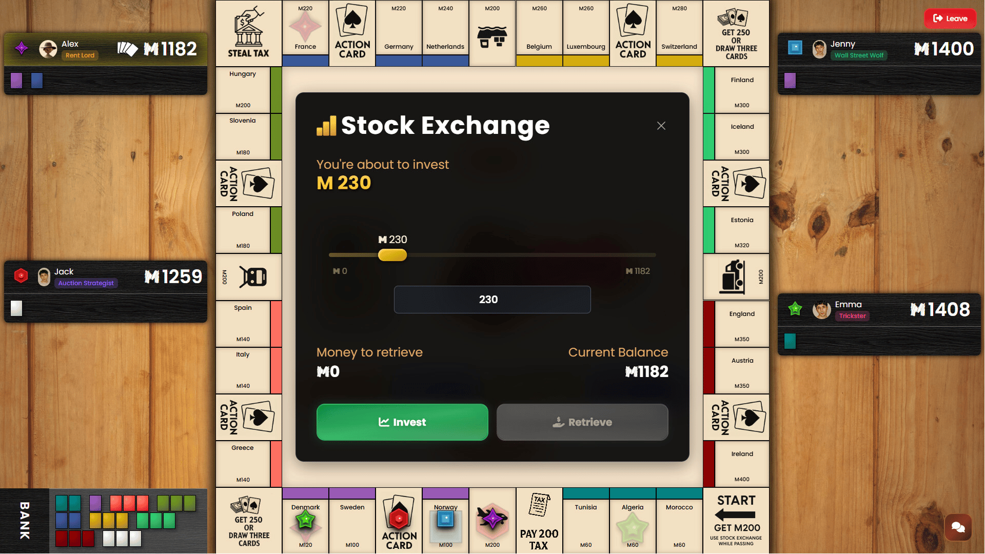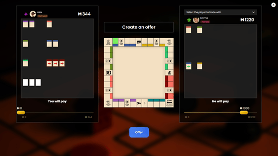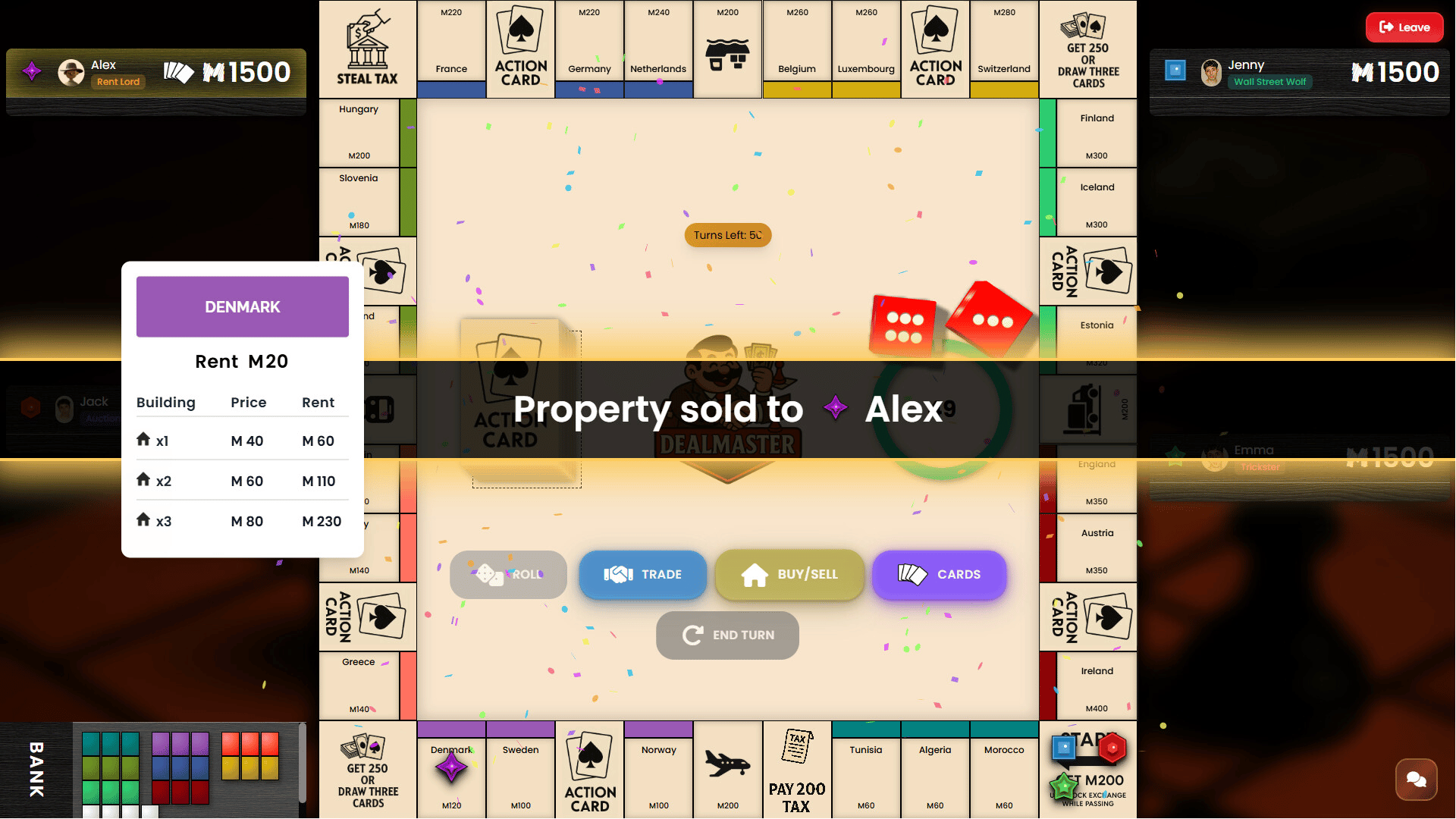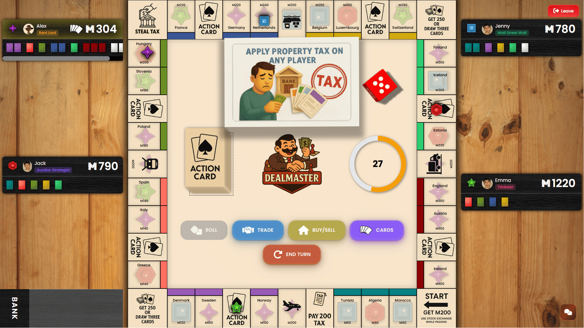 DealMaster is a board game where every property is won through auctions. Time your action cards, invest smartly in stocks, build or destroy houses, and strike trades. Master it all across 6 unique roles to outwit your rivals.