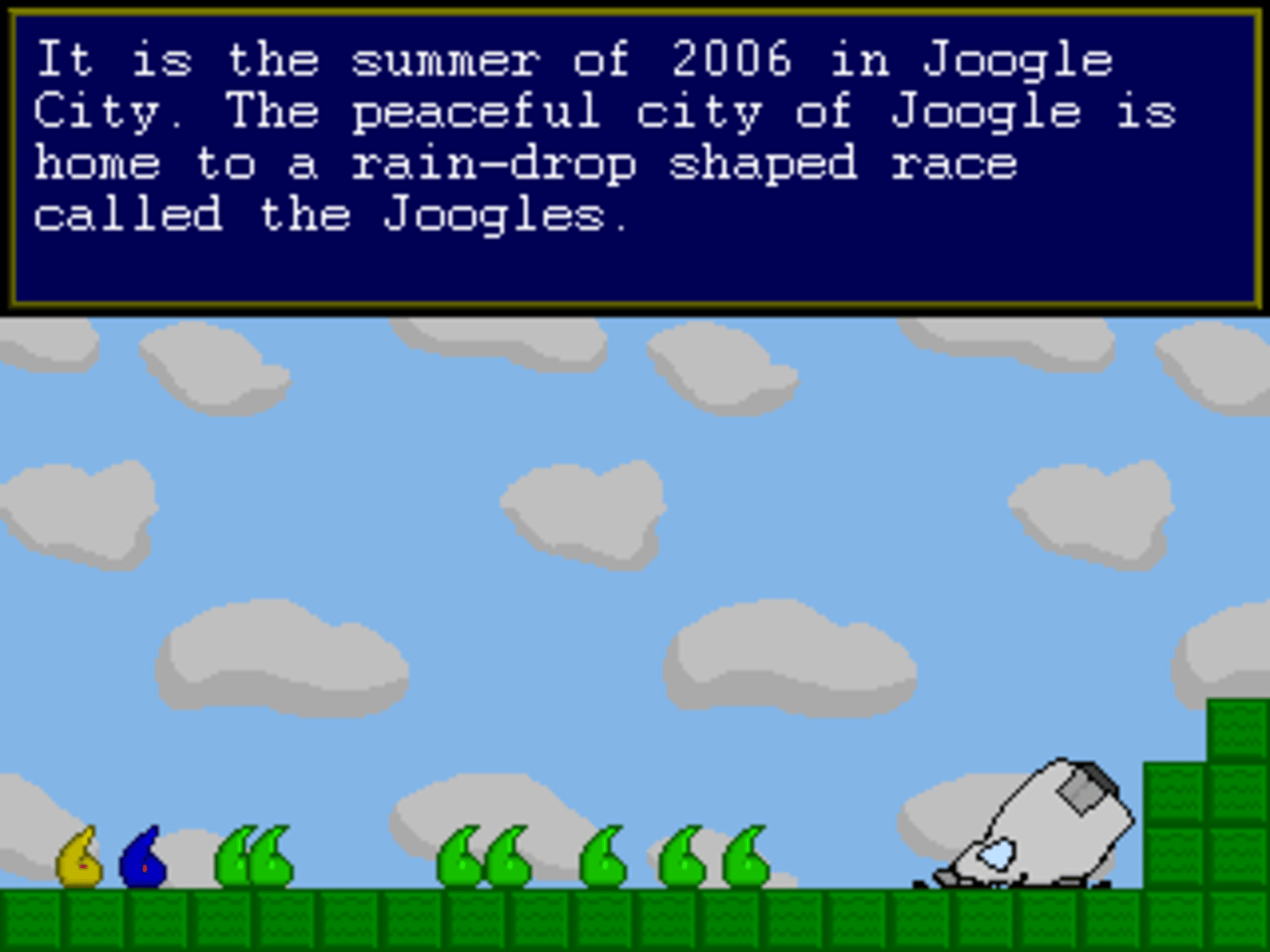 Joogle is a game about a Joogle named Joogle who lives in Joogle City on Planet Joogle and his brother commands the Joogle Army. There's also KING SURN who is very important to the plot.