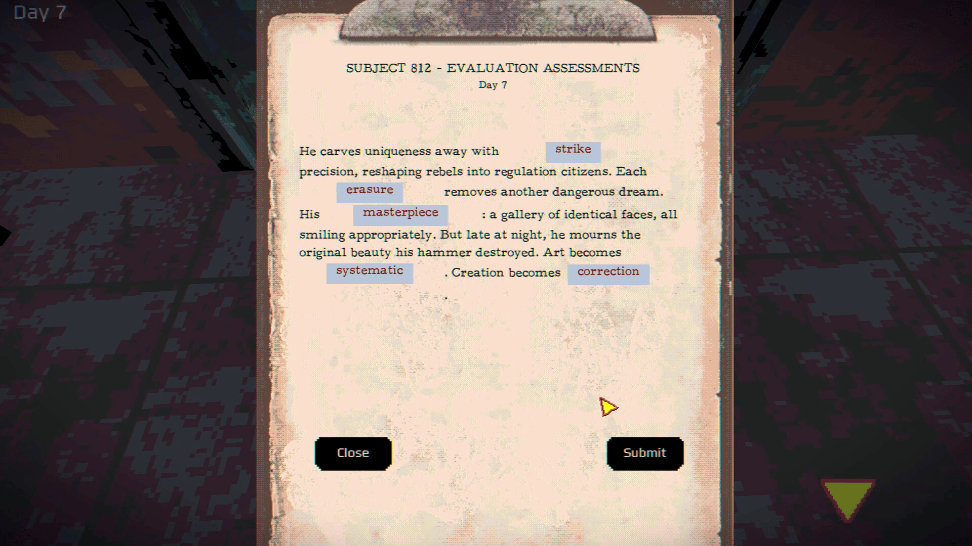 Velvet Hammer is an atmospheric tile game that fuses narrative curiosity with meaningful choices: Easy to learn, hard to forget. Over 12 days, you endure , and you navigate inter-day word-matching evaluations that measure (and manipulate) your identity.