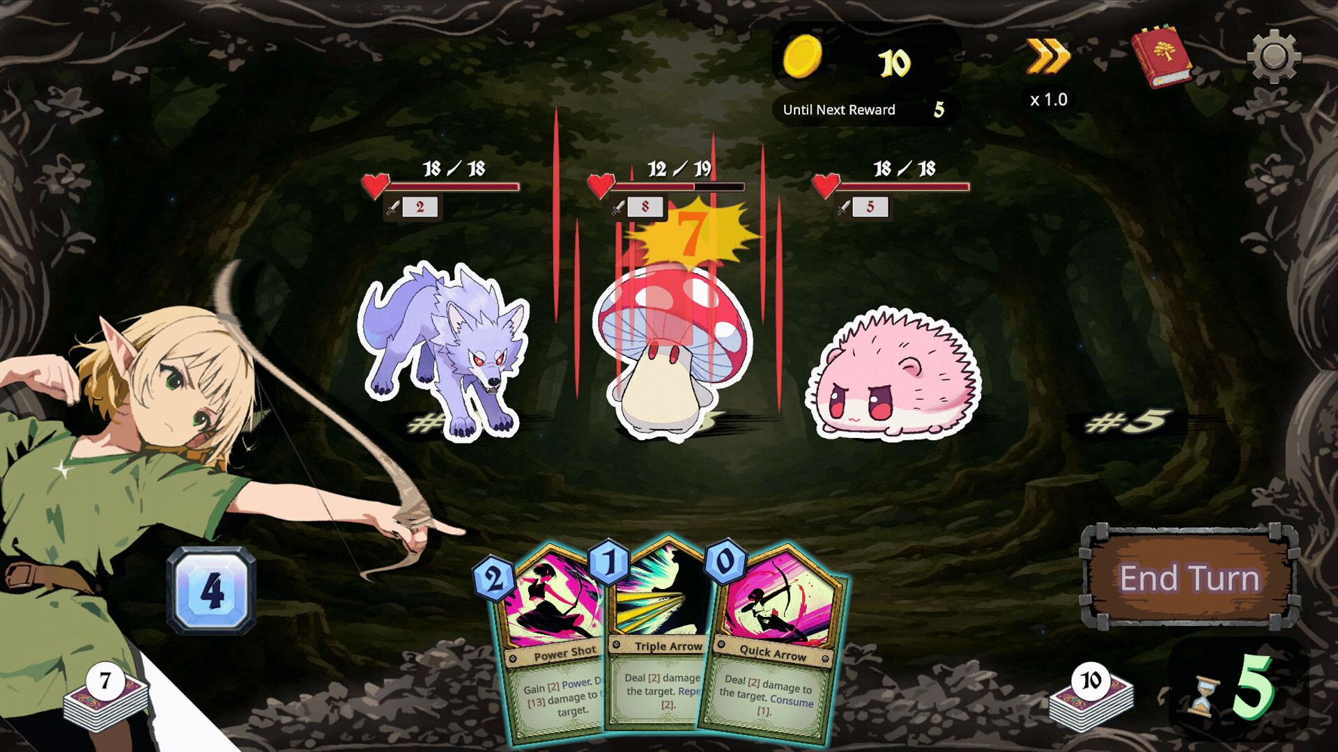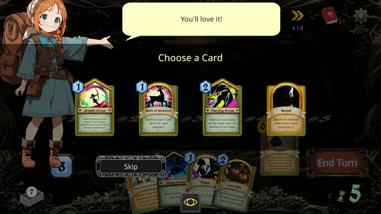 Call enemies from your hand, defeat them, and claim your rewards! Master a battle system with no need for defense cards, and strengthen your deck and abilities as you progress. In a forest growing ever more ferocious, your hunt drives you forward—what fate awaits at its end?