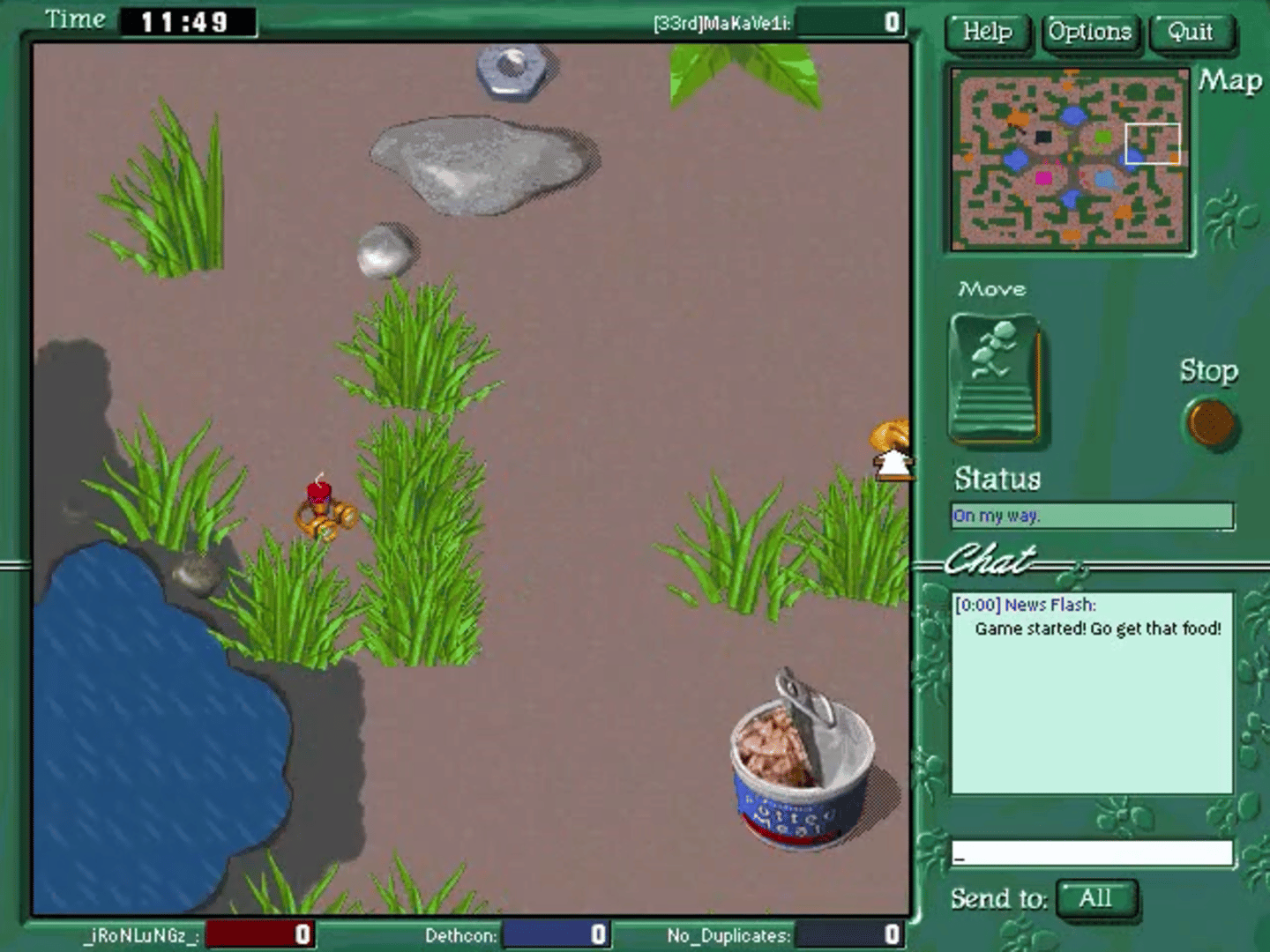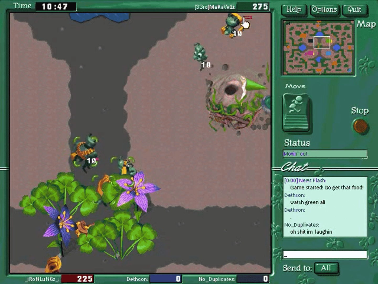 A multiplayer strategy game where you play as an army of ants making the best nest against other players. You win by gaining the most points which is done through eating and stealing food across maps. On January 31, 2006, Microsoft's Zone retired Ants due to a lack of players.