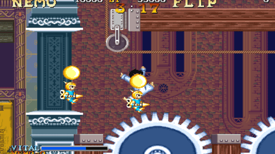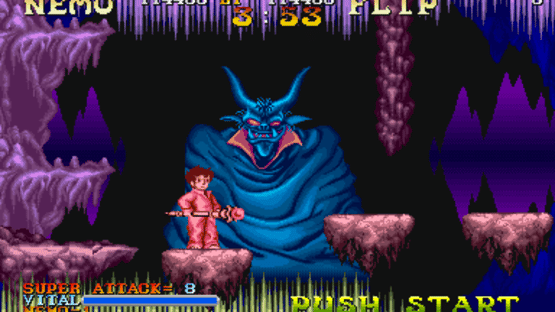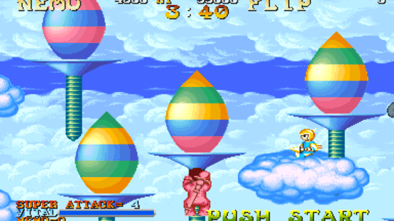 One night, as Nemo sleeps, he is visited in a dream by the King of Slumberland, who invites Nemo to come and play with the King's daughter, the Princess. Nemo finds himself unable to find the Princess however, so he and 'Flip', a strange companion who also turns up in the dream, decide to explore Slumberland and find the king. Nemo is a colourful and abstract platform shoot-em-up set in the dream world of Slumberland, a surreal world in which childrens' toys are running amok and must be destroyed. Nemo is armed with a magical staff that emits a burst of magic to destroy the many enemies, some of which require multiple hits. A number of power-ups also appear at regular intervals to aid Nemo in his quest through seven tough stages.