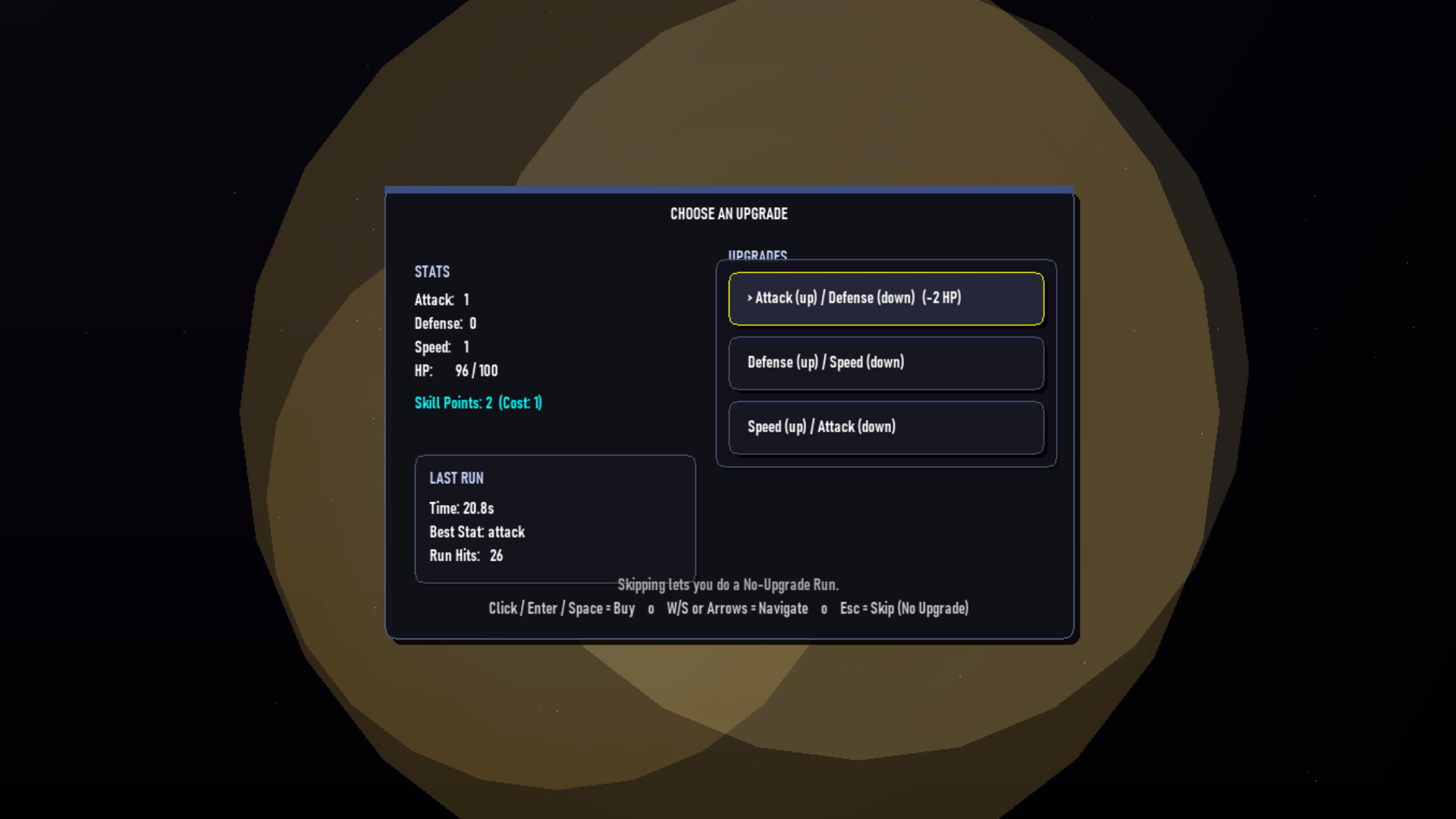 Take to space in this action-packed shmup, where every wave of enemies is rewarded with a buff and debuff. Play through the intense story and arcade modes to become an ace pilot. What stats will you increase? Which ones are worth the sacrifice? The battle begins!