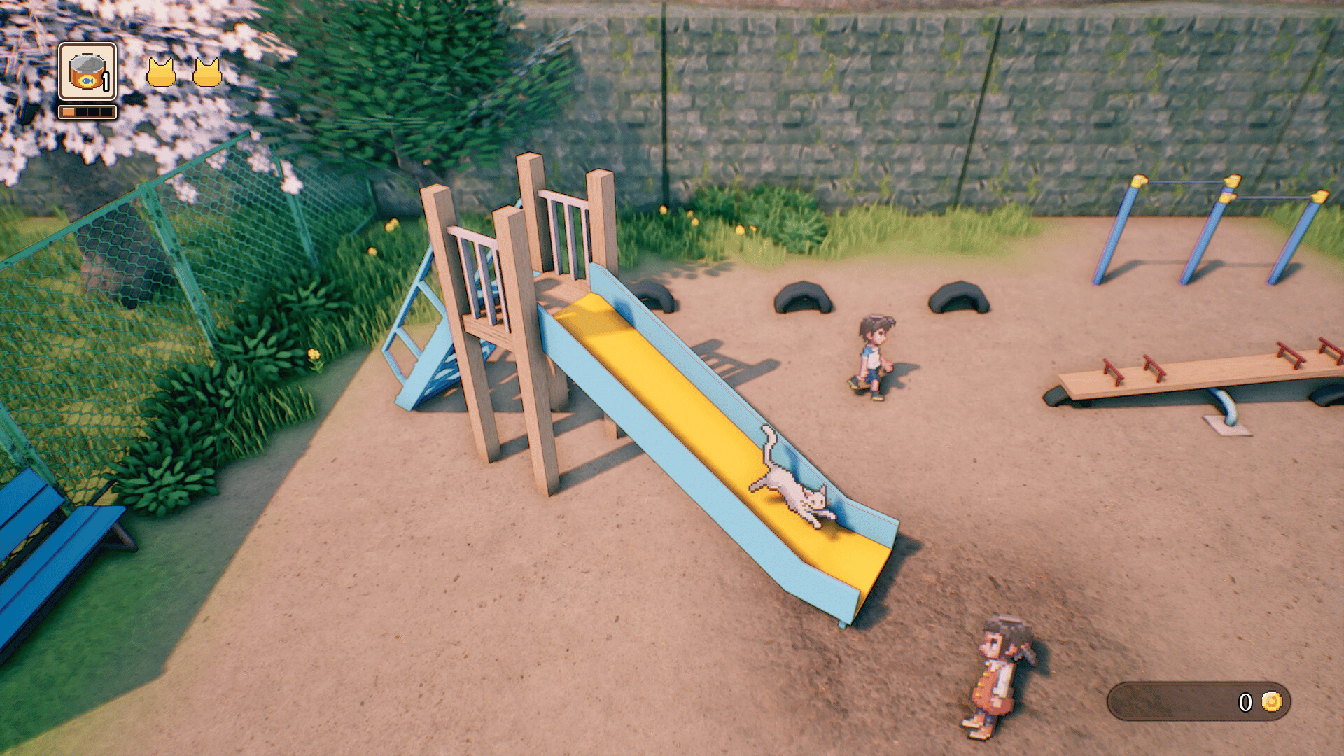 Explore Nanoha Town, in the Japanese countryside, during the cherry blossom season as a cat. Use unique cat actions like Wall Jump, Dig, Paw Swat and Wiggle Butt Dash to make your way to Sakurana Shrine, a place of memories with your late Grandpa.