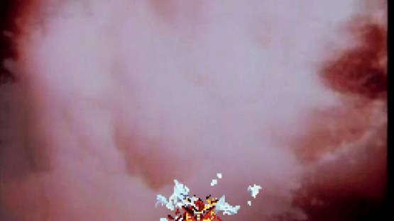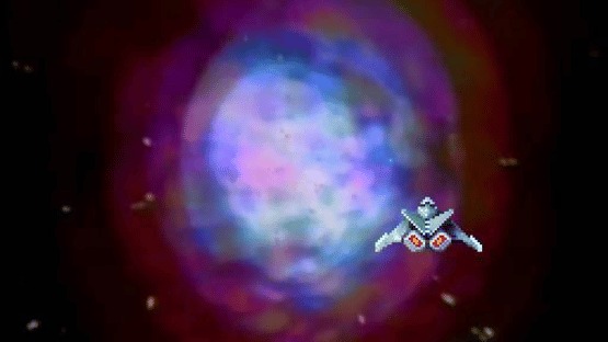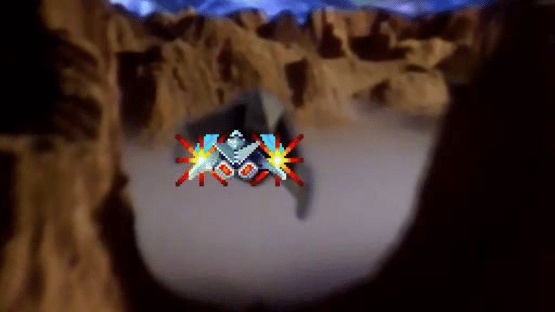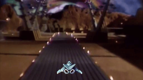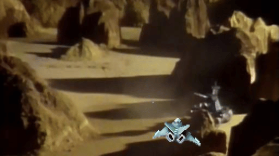 Interactive Laser Disc space battle game with computer-generated overlaid graphics. Control a space craft to defend against attacking enemy waves then destroy the enemy command ship. Huge explosions. Video images are from a Toei film - Message From Space.