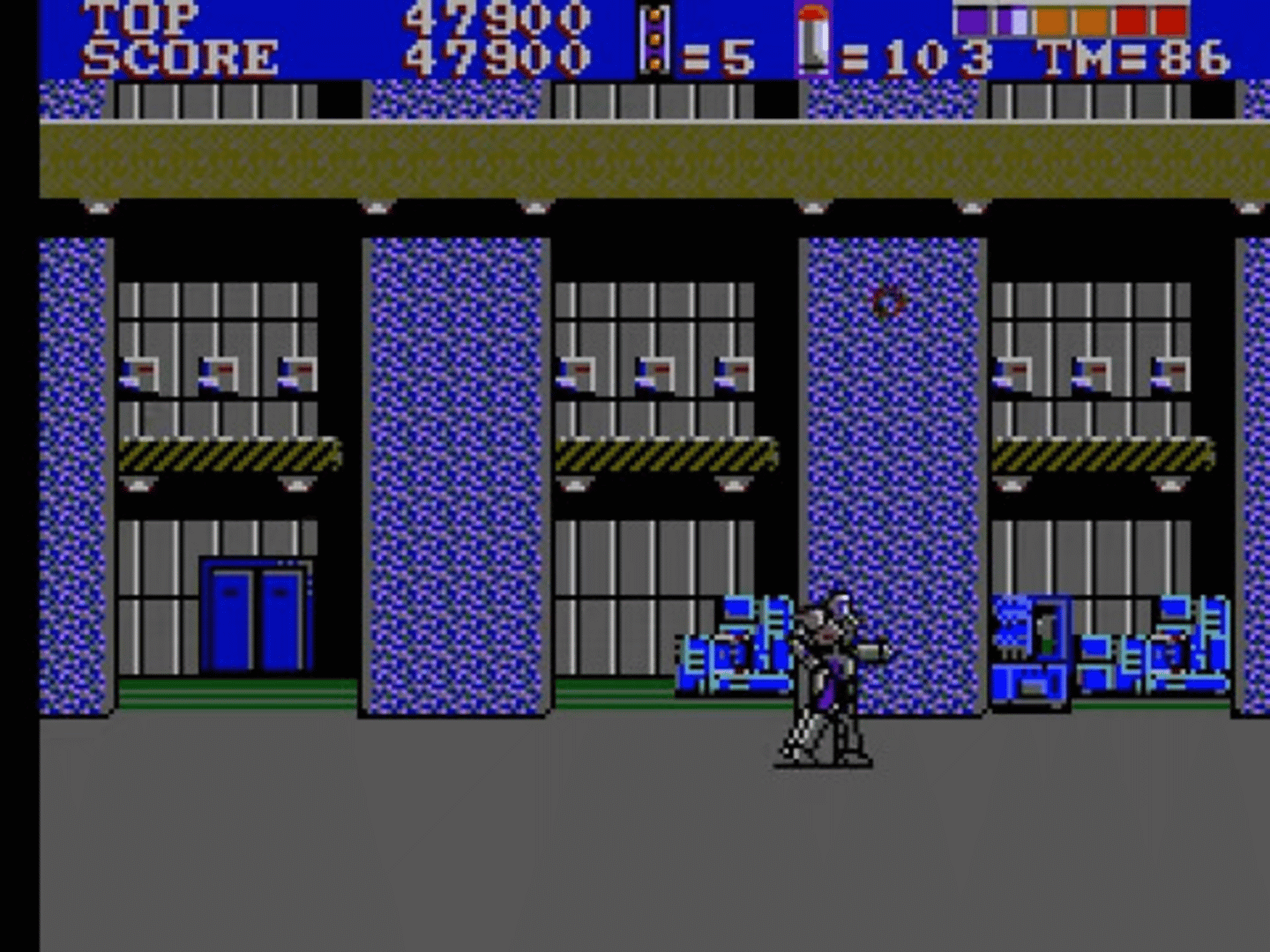 ESWAT is: the toughest fighting force alive! ESWAT means: Enhanced Special Weapons and Tactics! You're staring straight into the evil E.Y.E., a power-mad horde of vicious terrorists. But you are the ultimate crimebuster. Decimate their front lines with your lead-belching Gatling gun! Incinerate their mobs with your spinning flame thrower! Start as an ESWAT rookie and blast your way up to become an awesome supercop - more machine than man! Metal attack! Annihilate helicopters, machines, and maniac robots. Feel the heat while bulldozing crazed "experiments." Hear, see, and smell the danger when sewer ooze turns into man-hungry goo. Grapple with bionic monsters to face the final showdown! Stay glued to your weapons through 8 missions of grueling combat! You have the ultra-tech gear and the guts to survive! The ESWAT force is waiting. Hit the streets!
