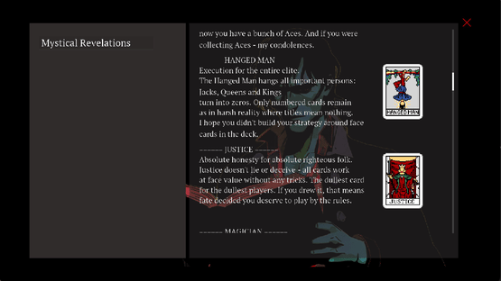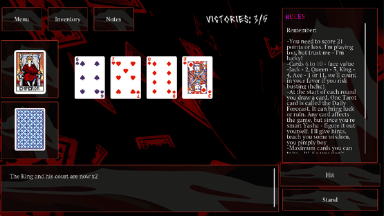 Tarot meets Blackjack with psychological horror inspired by Dostoevsky. A gore card game based on one of the strangest novels. Gameplay with puzzles, dark themes, surreal horror, cards and black humor. Experimental gameplay blending multiple mechanics