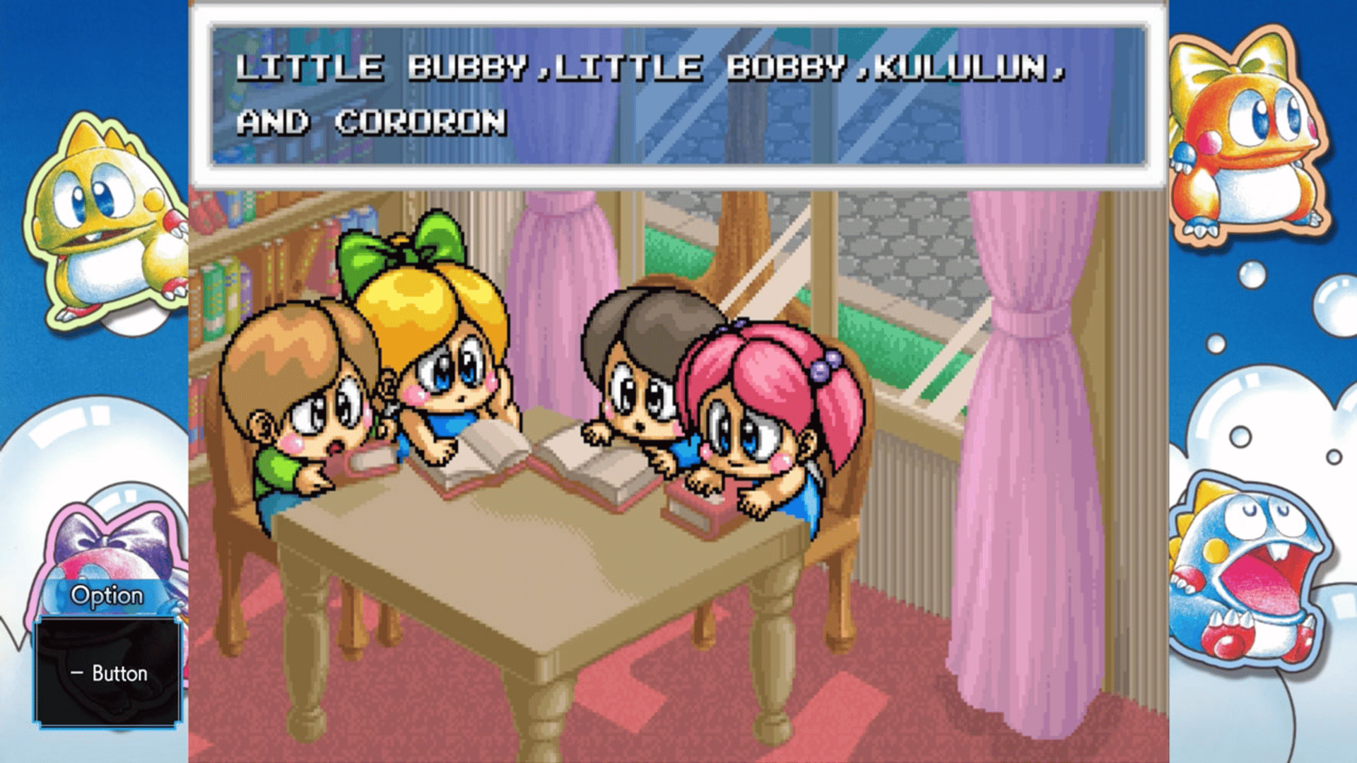 Bub and Bob are once again transformed into bubble dragons and have to climb up the Rainbow Tower to fight the Super Dark Great Dragon, while collecting potions to turn back into human form. Bubble Memories does very little to change the gameplay of the series, except for introducing giant enemies on some levels, different bosses, and a way to blow giant bubbles after charging up (especially for killing the giant enemies). (Giant bubbles can be blown by charging up the character. The bubble button is held until the character's horns begin flashing, and then releasing the button.) There are a total of 80 levels, while the last 10 levels can only be accessed by collecting 7 potions.