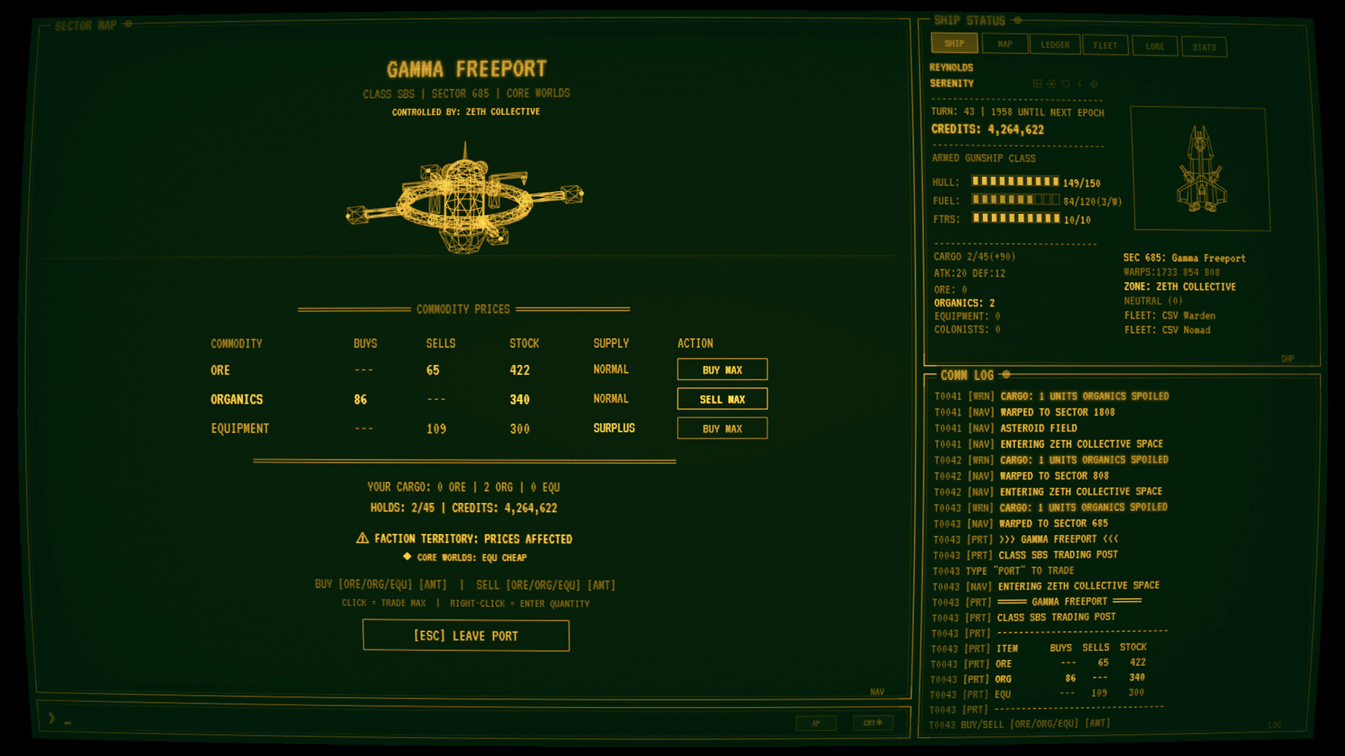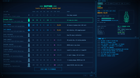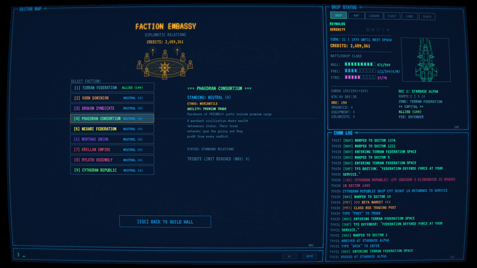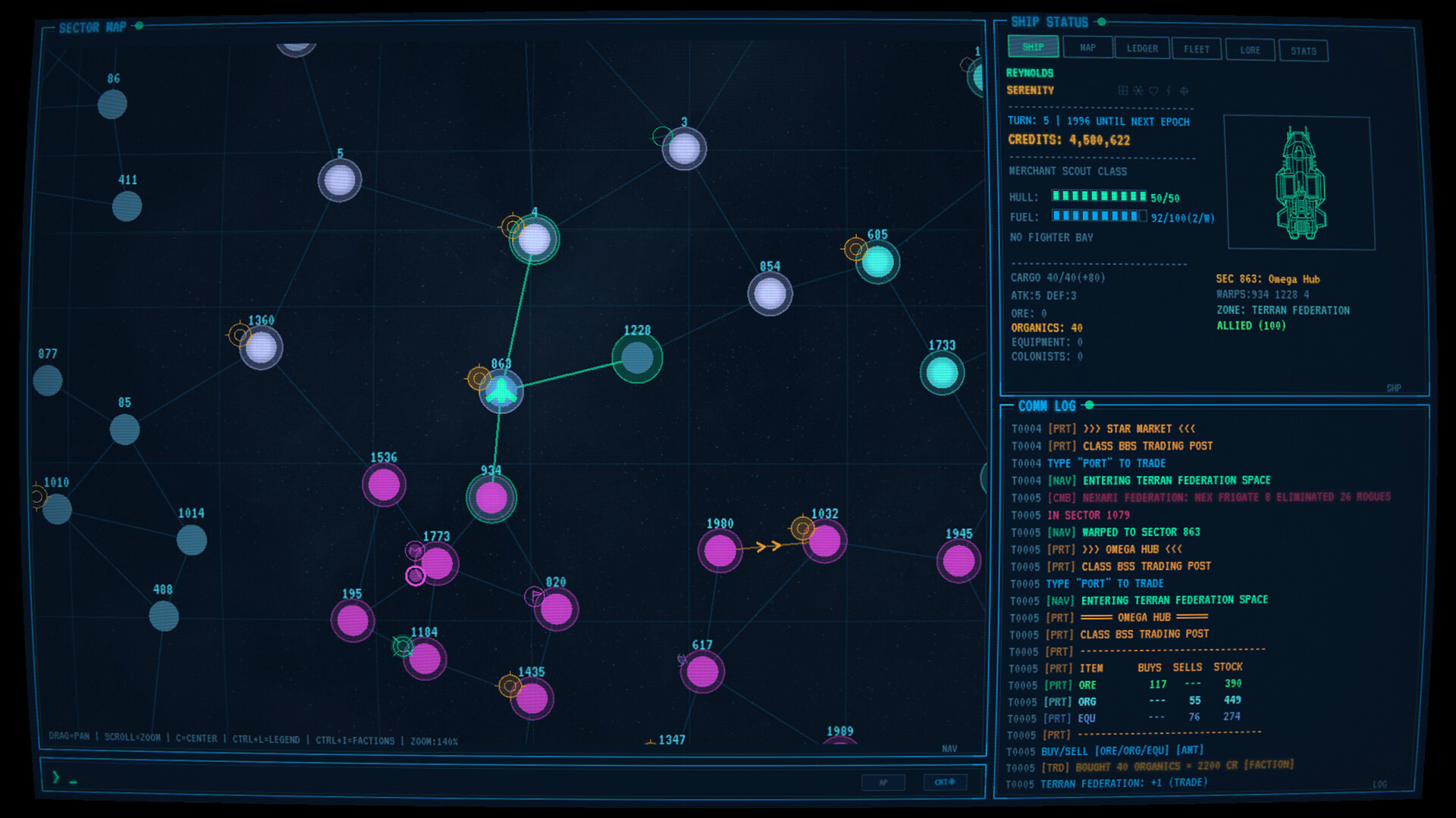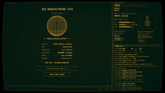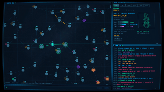 Trade, fight, and explore a procedurally generated galaxy in this deep space trading game inspired by 80's sci-fi computer screens and early text based space games. Command fleets, negotiate with alien factions, colonize planets, and forge your legacy across five unique career paths.
