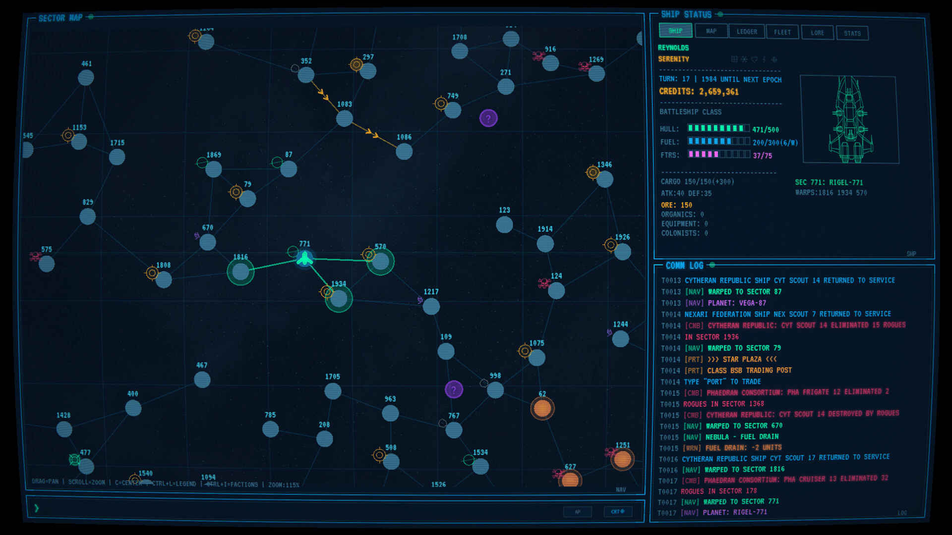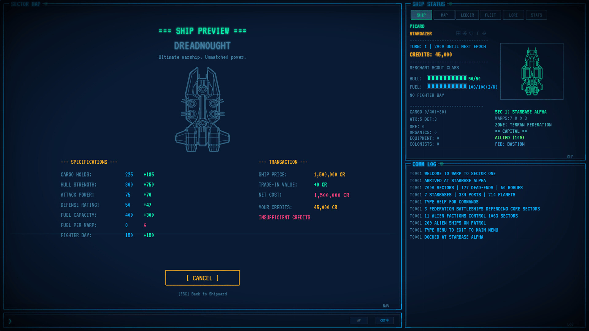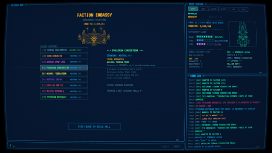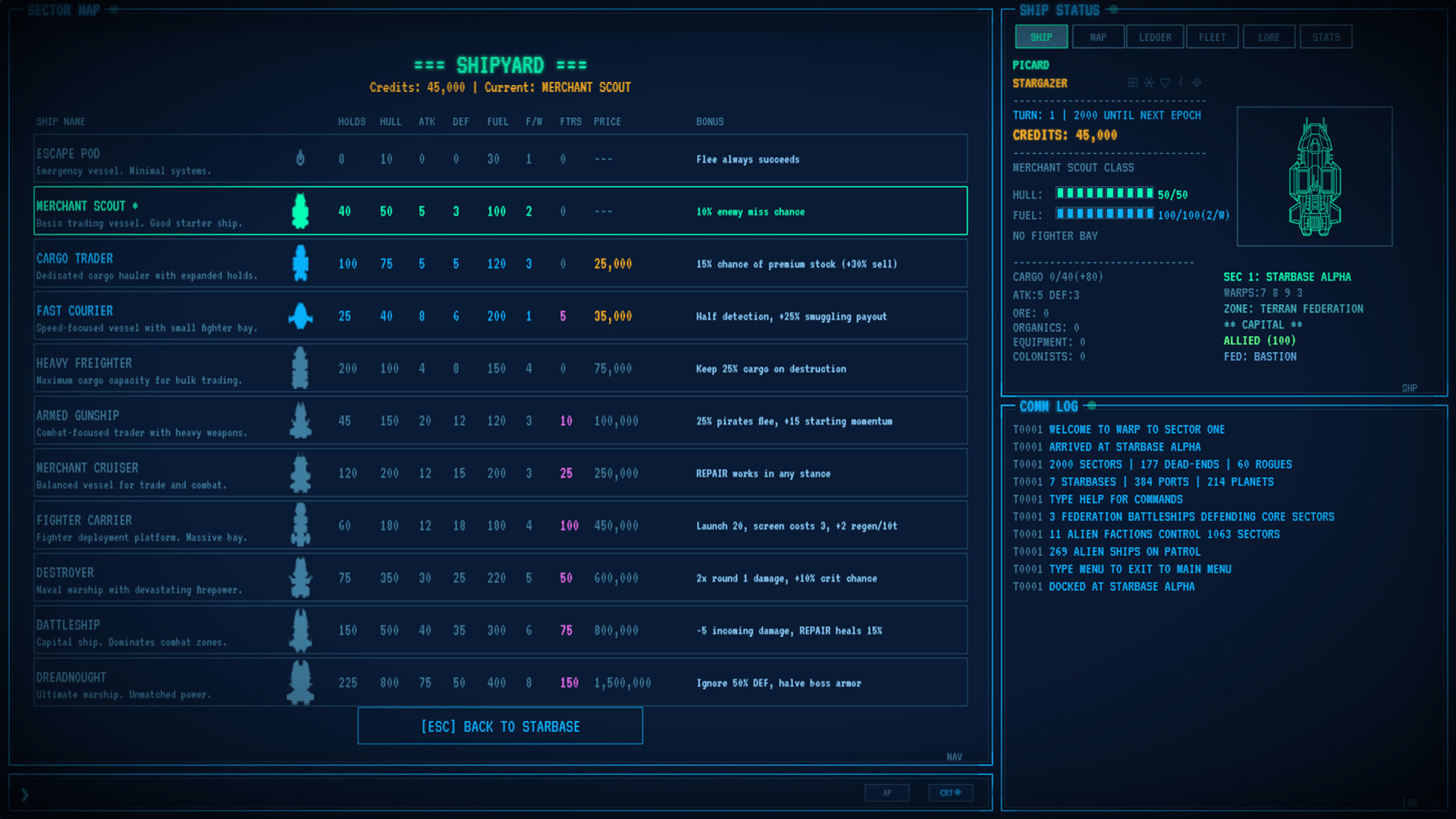 Trade, fight, and explore a procedurally generated galaxy in this deep space trading game inspired by 80's sci-fi computer screens and early text based space games. Command fleets, negotiate with alien factions, colonize planets, and forge your legacy across five unique career paths.