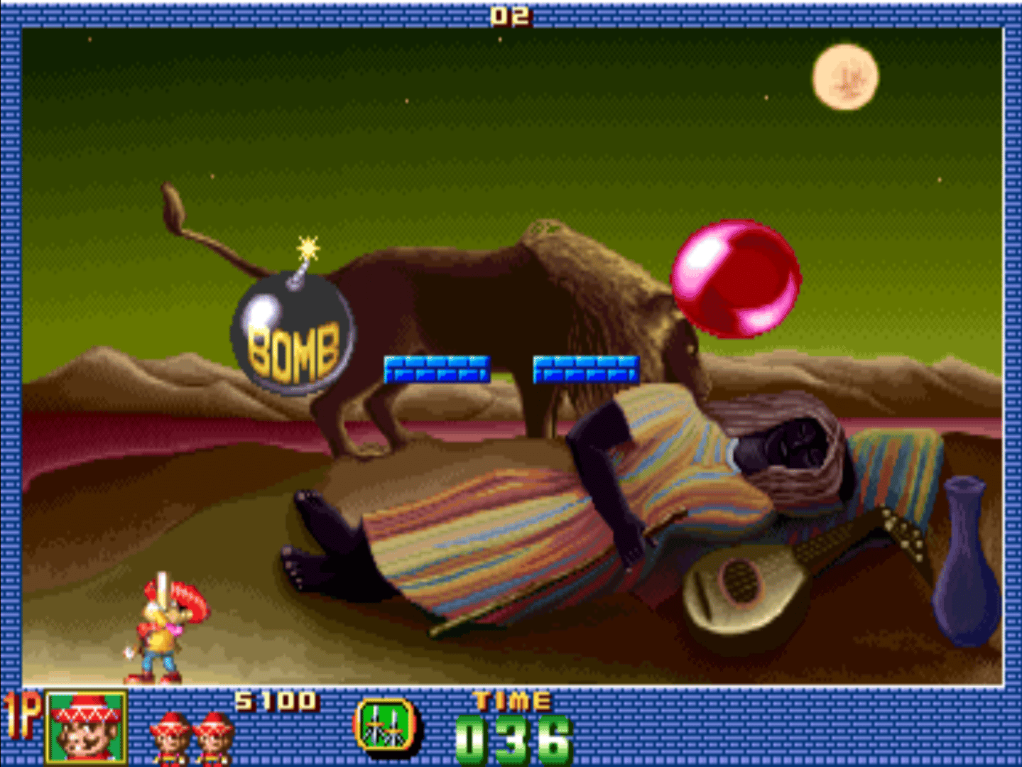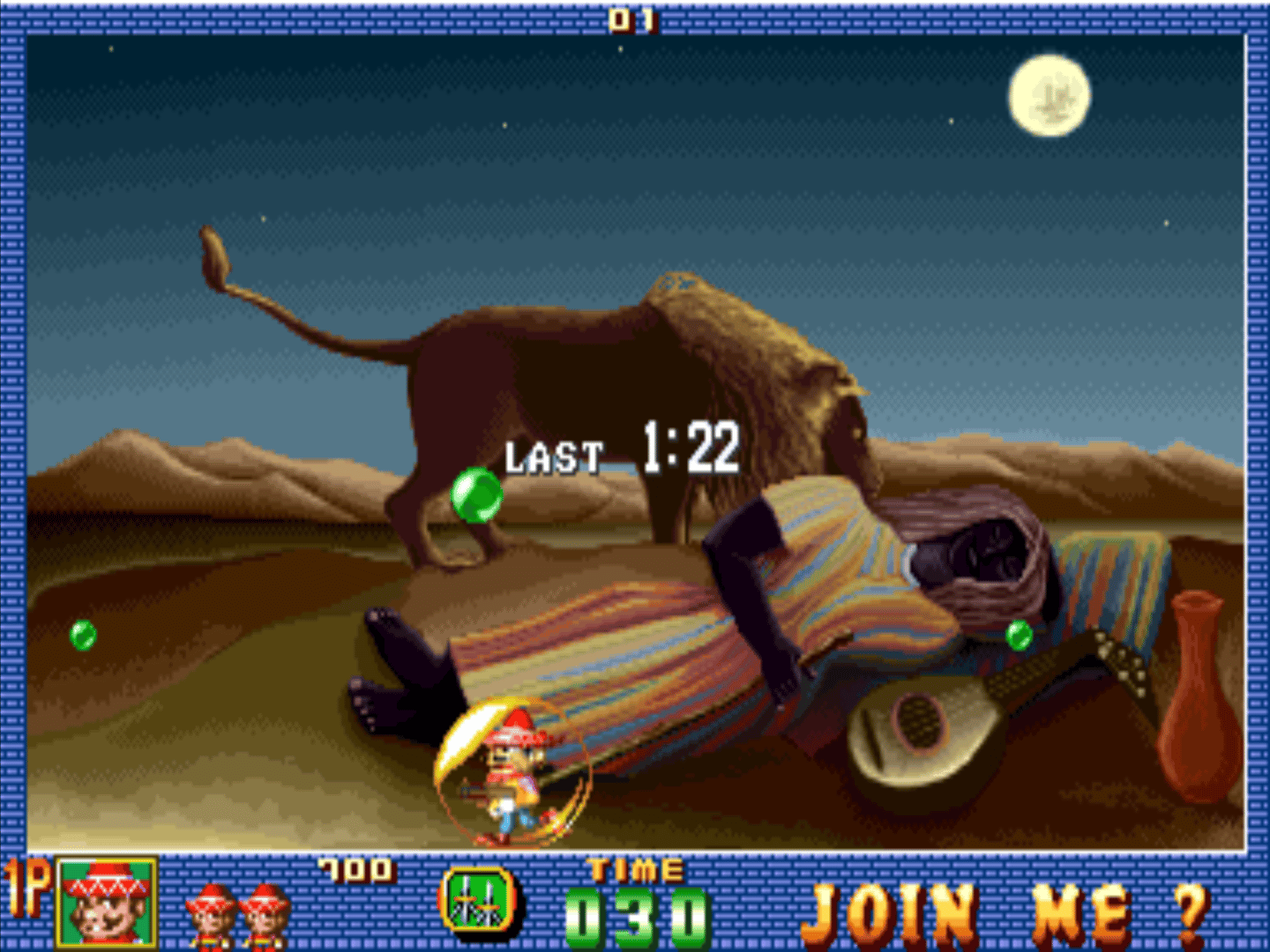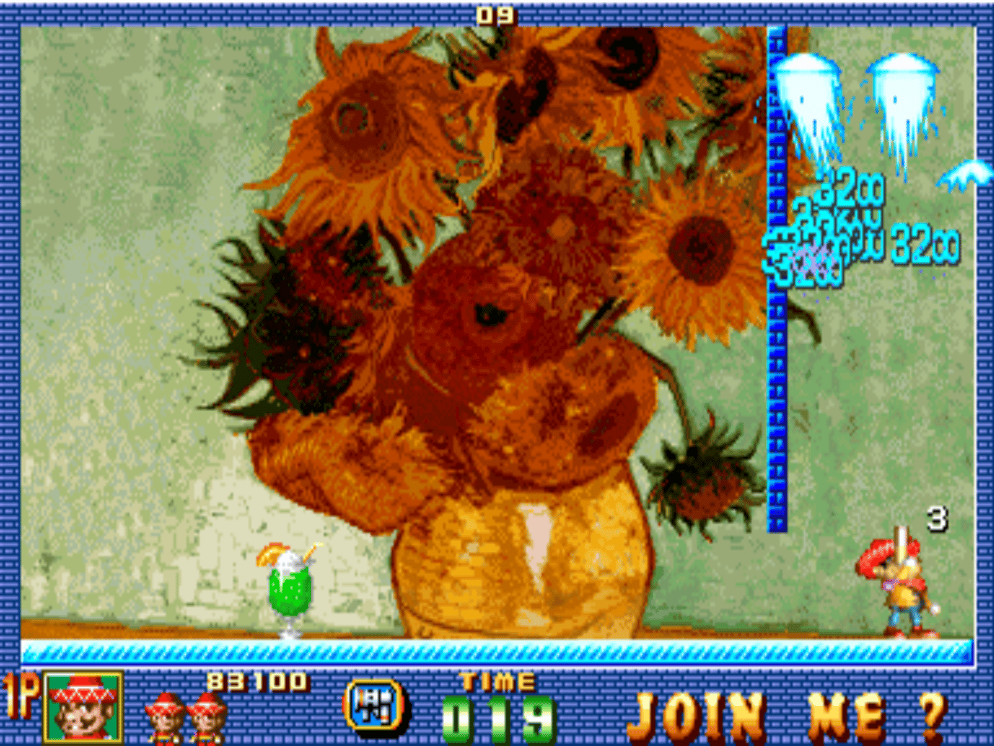 Your character is locked inside an art museum and has to avoid bouncing balloons of various sizes, most of which split when hit. The player has the option of "normal" play with stages or "panic" mode in which balloons will appear continuously. In normal mode, watch out for characters like birds and dogs that will paralyze your character.