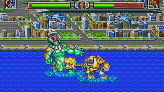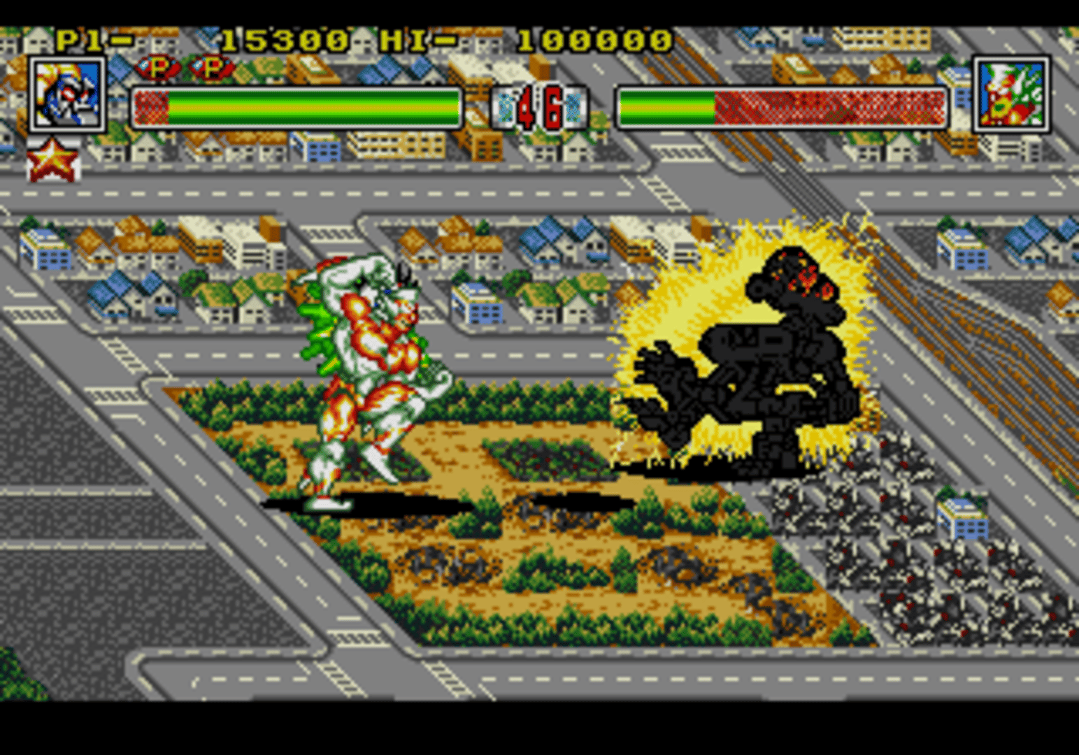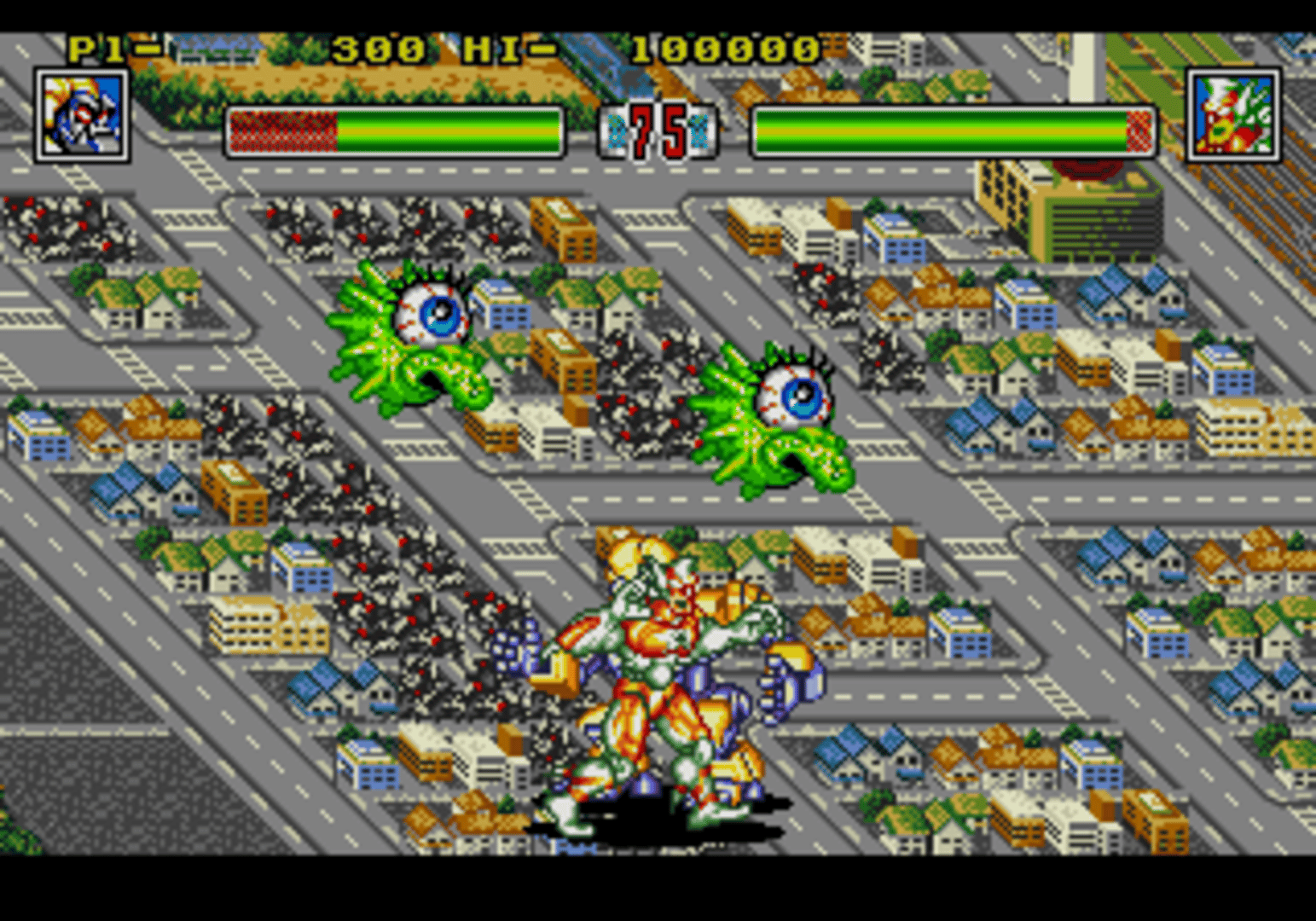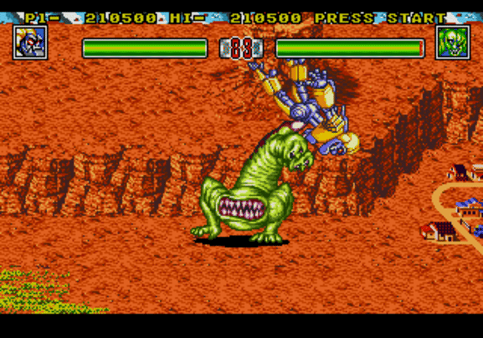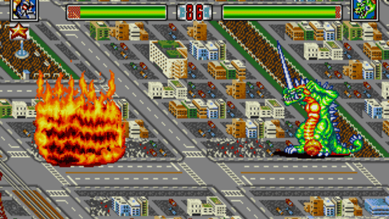 King of the Monsters 2 on the Sega Genesis is a slightly different game than the original Neo Geo version. While the original let you play one of three different monsters to go through side-scrolling beat'em-up stages and fight (non-playable) monster as boss enemies, the Genesis version was re-worked into a one-on-one fighter similar to the first King of the Monsters game. Apart from Farmardy, all characters from the Neo Geo version are playable. To win, the player must defeat all other monsters and a clone of the played monster in a fight. The matches take place in areas built from the original levels, and feature destroyable landscapes and secondary enemies, both of which can be smashed to gain points and power-ups.