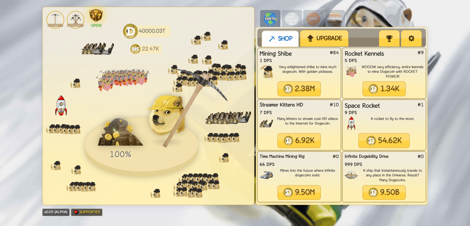 Dogeminer: Community Edition is a DogeCoin Space Empire Mining Simulator Incremental Clicker game built and fueled by the community. It's intended to be an expansion upon the original games (Dogeminer 1 & 2), with a mix of old and new features, and suggestions from the community. The game is entirely open source, with all code for the game available on GitHub for modding, projects, or really anything (the code is free to use under the Apache license! The assets have a separate license however, so be sure to read that!)