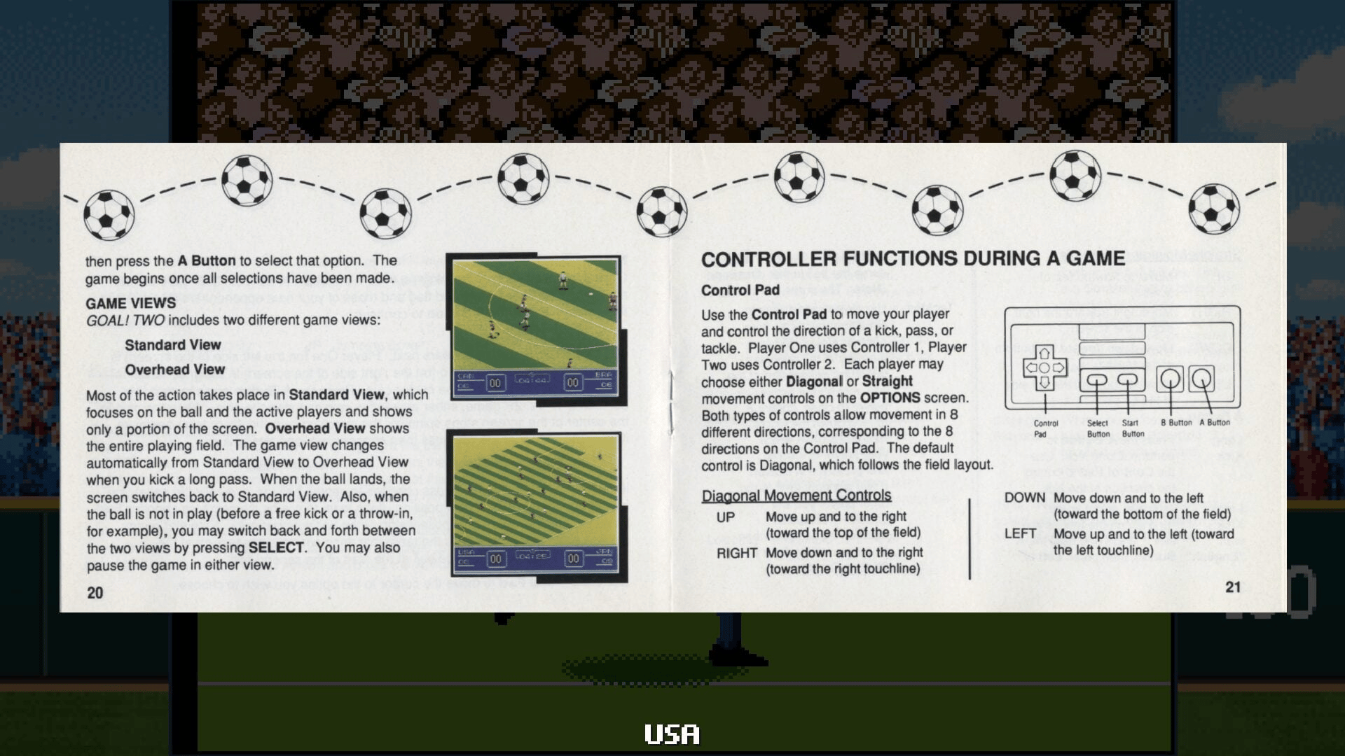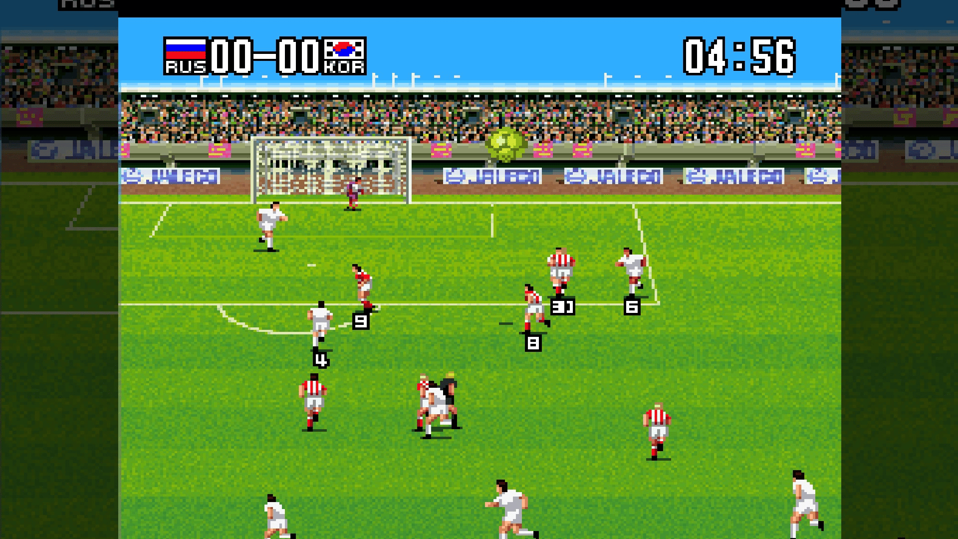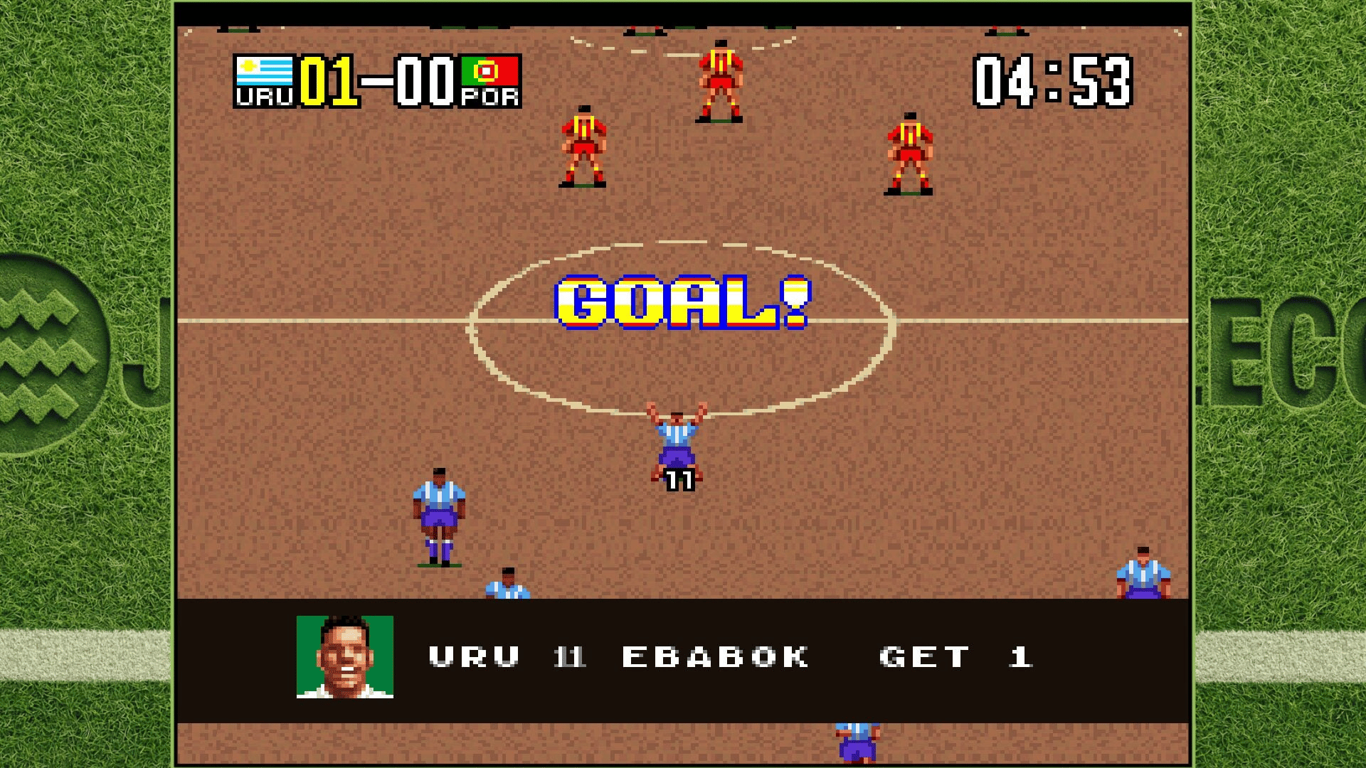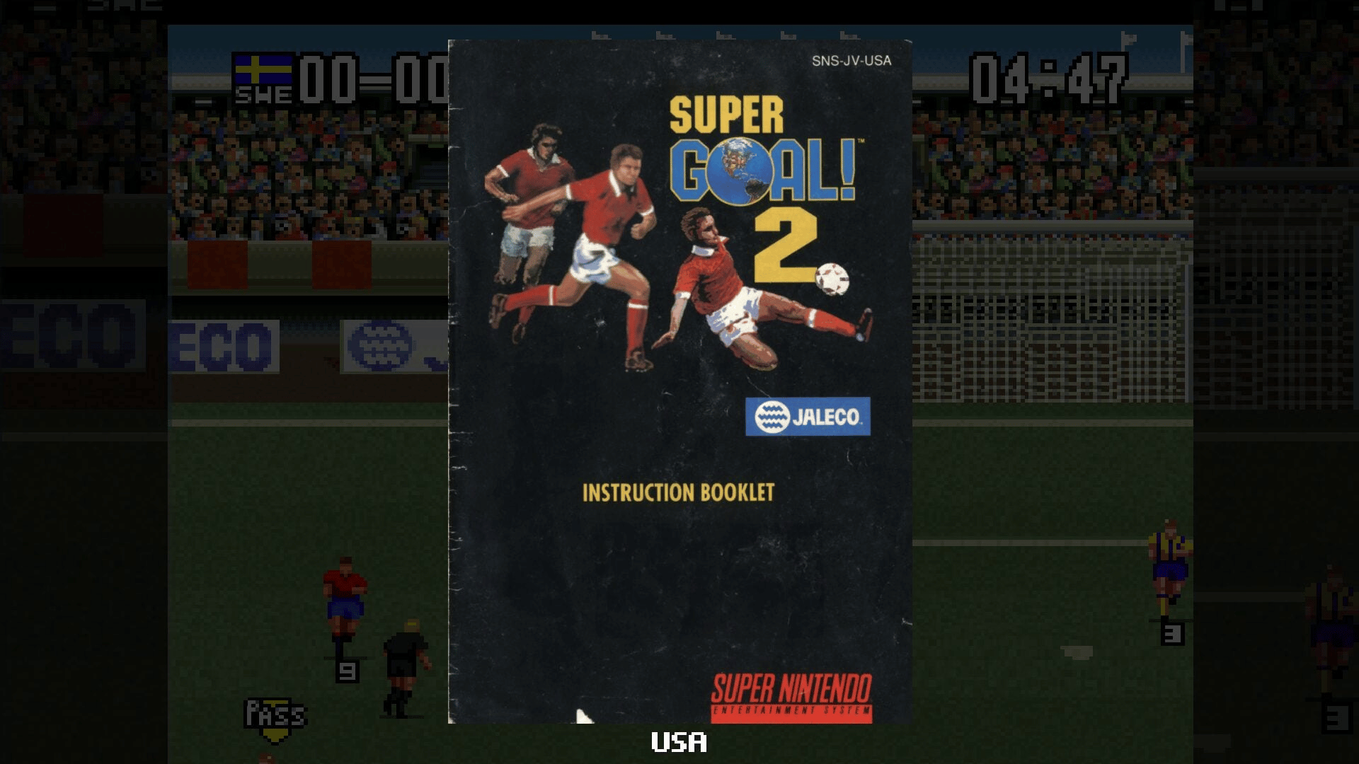 Jaleco Sports: Goal! 2 includes four games—three from the Nintendo Entertainment System / Famicom era: Goal! Two (United States / Nintendo Entertainment System, 1989), Goal! 2 (Europe / Nintendo Entertainment System, 1989), and Goal! (Japan / Famicom, 1989)—and one title from the Super Nintendo, Super Goal! 2 (US-SNES – 1992). Goal! Two shifted the game perspective from the top-down view of the original Goal! to an angled overhead view with a scrolling screen. An additional eight teams have been added to Goal! Two (total of 24) and overall team roster size is 15 players, with the ability to choose your 11 starters based on their stats. The Super Nintendo Entertainment System sequel, Super Goal! 2, expanded on the original with a side-scrolling field, 24 international teams, instant replays, and full-field radar views. It also introduced strategic options like four defensive formations and more player control.