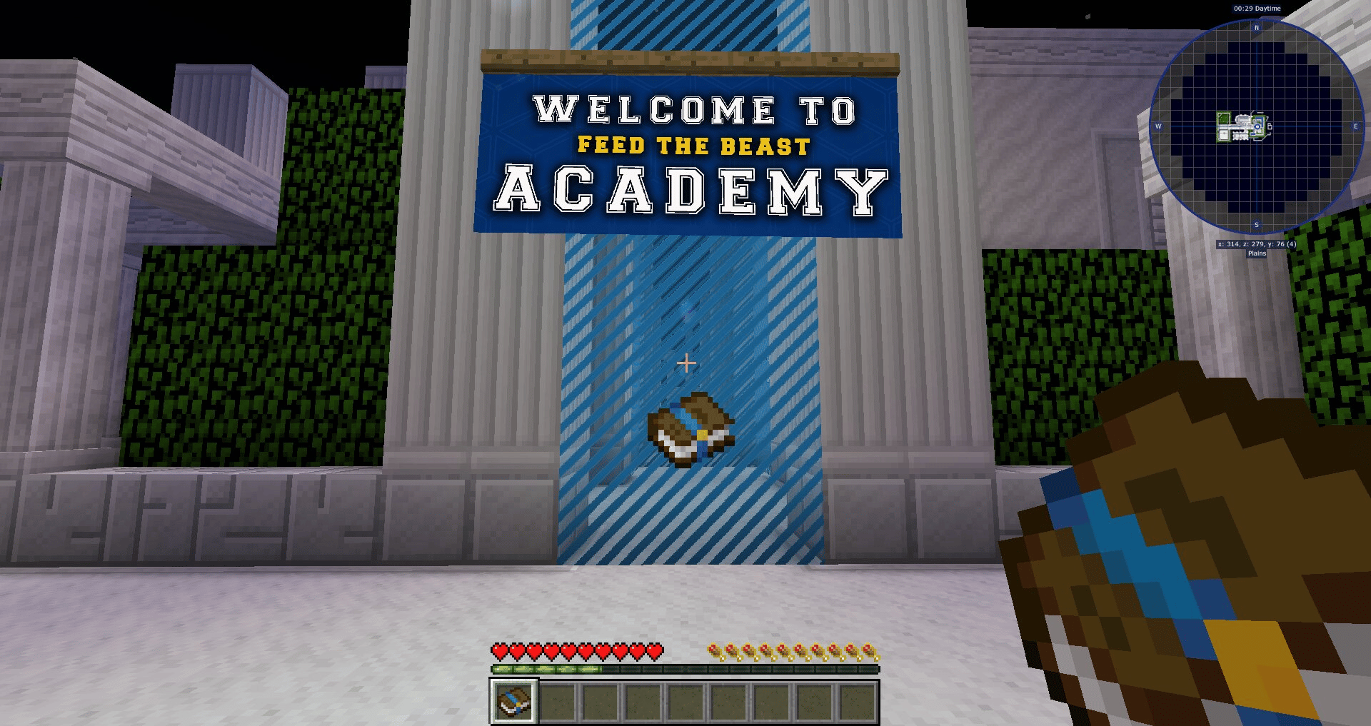 The biggest problem people have when they first start playing modded Minecraft is that there's no clear choice for which modpack to play. Learning the mods requires scouring online wikis and guides, and watching videos. FTB Academy aims to fix that problem. It is designed especially for people that have never played with mods. The modpack has over 300 quests to walk you through each step of the progression of the most common mods, and nearly 100 pages of Guides to give a more in-depth explanation for what needs it, so you don't have to go searching through wikis. Players will spawn in school structure, where they will follow quests and in-world images to learn modded concepts like automation, technology, and magic. Once this tutorial area has been completed, you will be teleported to the Overworld to begin playing properly. FTB Academy has no changed recipes and no altered progression, aside from the school, in order to accurately represent the average modpack.