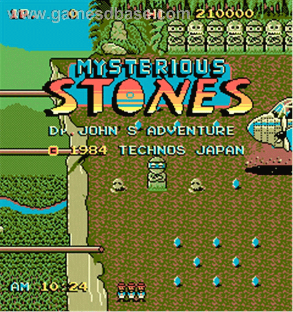 Mysterious Stones: Dr. John's Adventure, known as Mysterious Stones: Dr. Kick's Adventure in Japan, is an arcade title produced by Technos in 1984. In this game you play as the titular Dr. John, an archaeologist who travels around the world exploring temples and finding stones. Break open as many stones as possible to acquire rare artifaces while avoiding or defeating the temple guards.