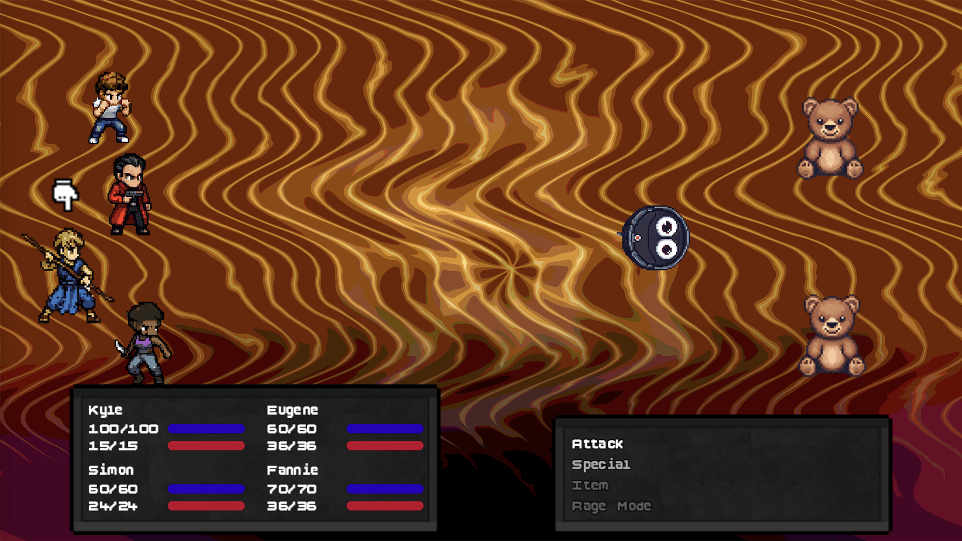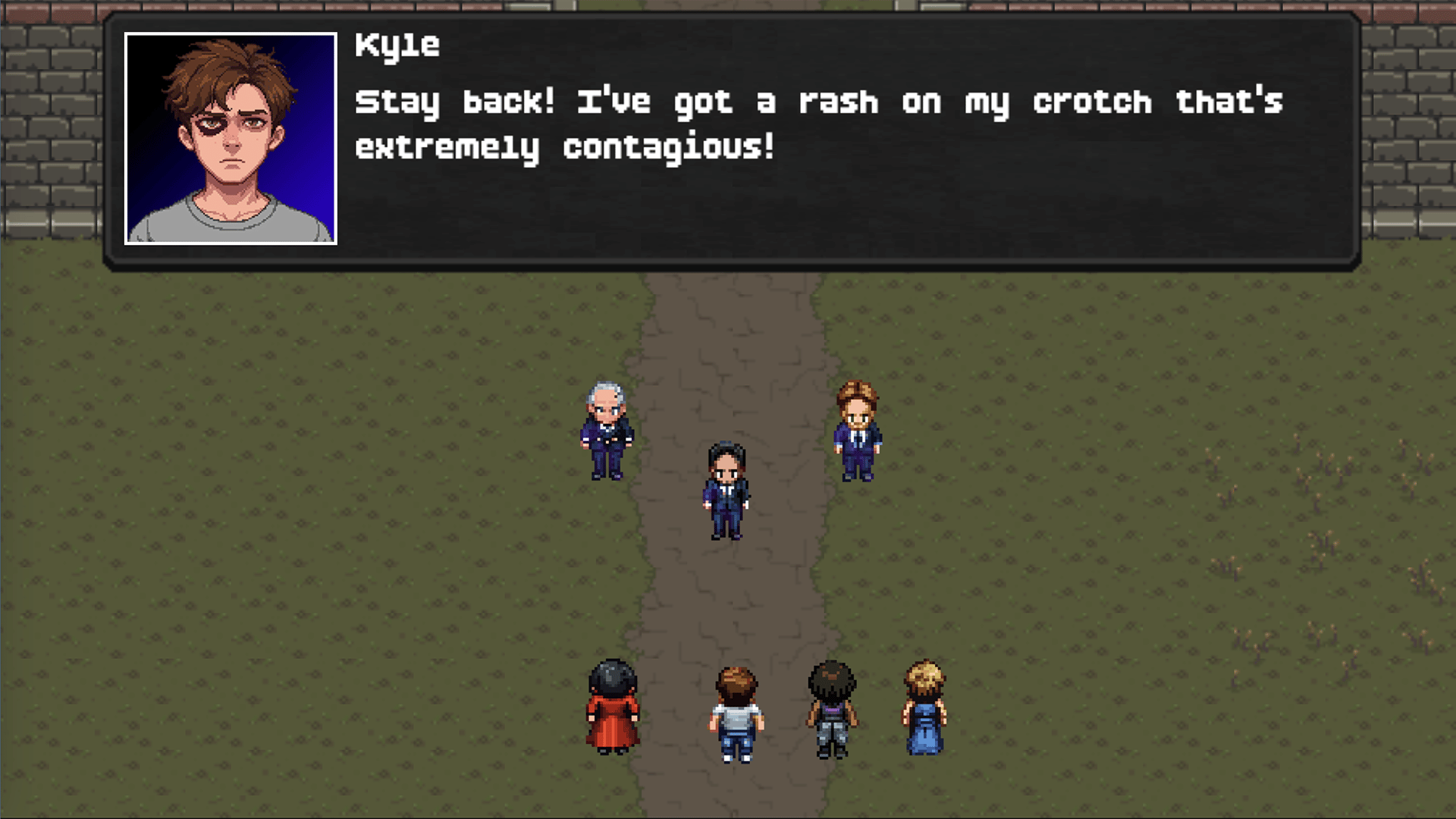 A new modern, turn-based pixel RPG by Rust Games! Silly tone, serious quest. Set in a dystopian America, the party must overthrow evil feudal lords called the Quorum while managing Kyle's worst impulses.