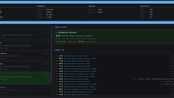 A persistent idle MMORPG, with a text-based hacking theme. Enjoy the "Inaction RPG" design philosophy by crafting equpiment using ARPG influenced prefix/suffix systems, build or join player managed syndicates, trade on the marketplace, and compete in community events.