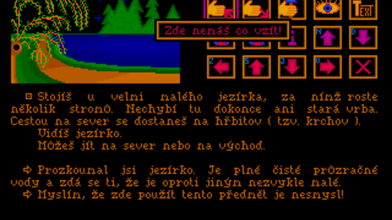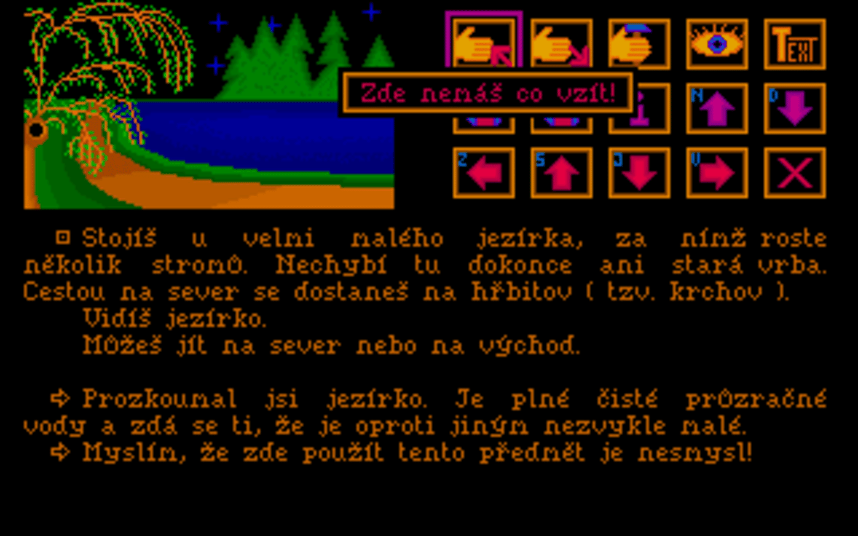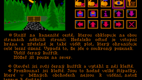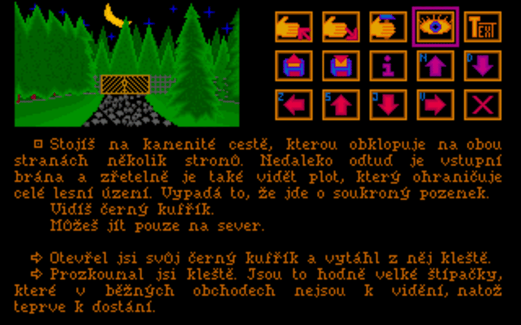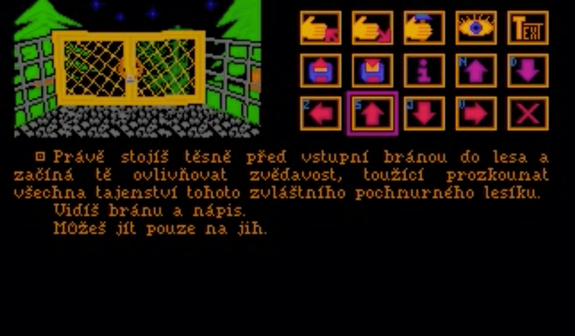 Players navigate through a series of screens. Possible directions to travel and objects are listed on the screen. Players are able to die. The graphic have a resolution of 320 × 200 pixels. Each location is described with words, while accompanied by an image.