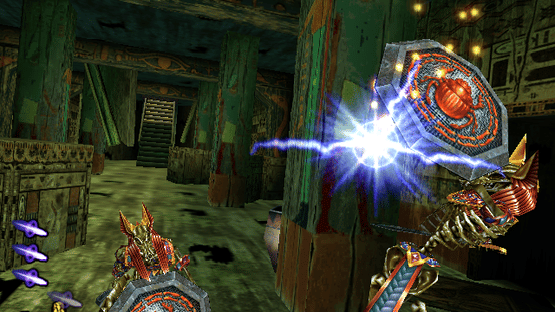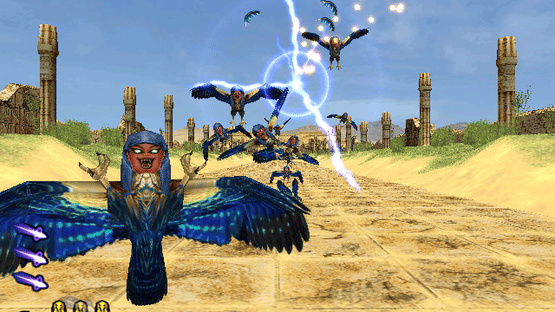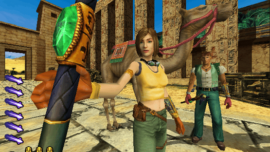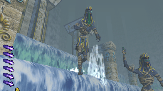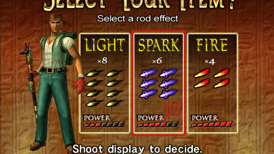 A 1 to 2 player shooting game where each player assumes the role of an archaeological treasure hunter armed with a magical cane who travels across rivers and deserts and explores the insides of pyramids searching for lost treasure while killing mummies and other evil creatures. Each player gets a choice of what kind of firepwoer to use for his or her character's magical cane: Light, Spark, or Fire.