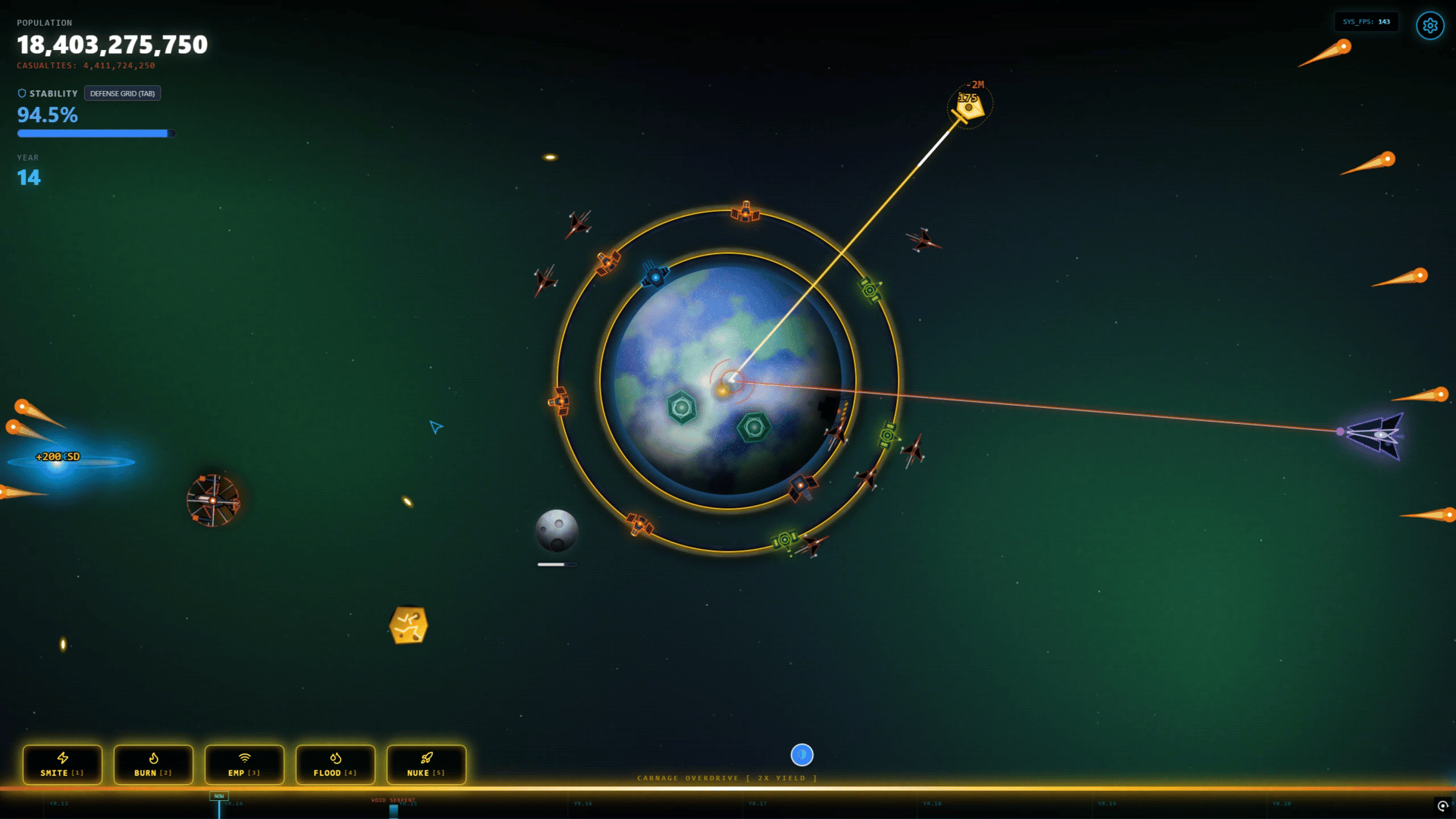 In this top-down planetary defense shooter, your job is to strap an absurd amount of automated weaponry to a doomed planet and try to hold the line. When the swarm inevitably breaks your perimeter and eats the Earth, the run ends. But your spectacular failures generate "Stardust," a highly unethical currency you can use to buy shinier guns, thicker shields, and more devastating orbital lasers for your next doomed attempt.