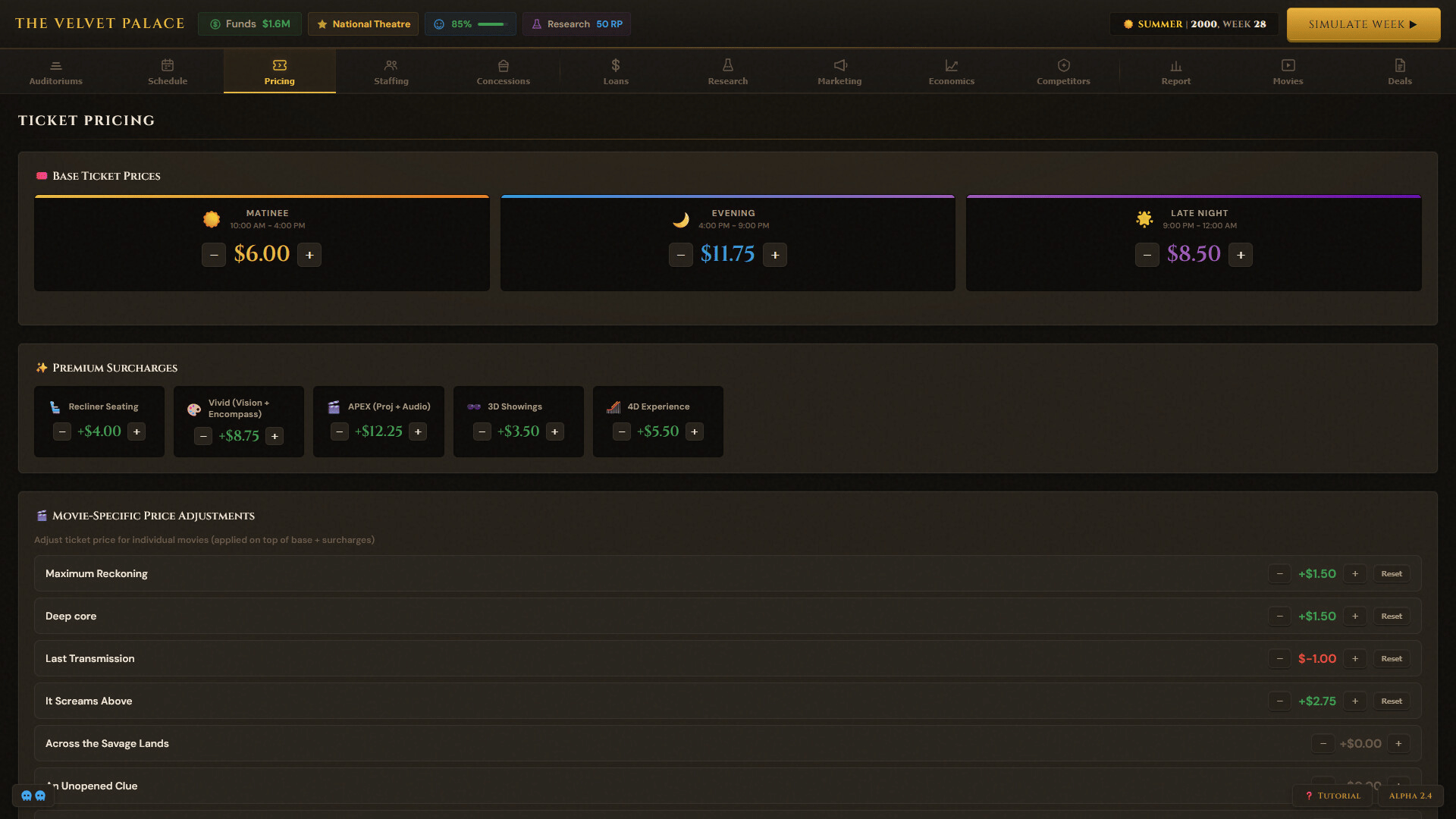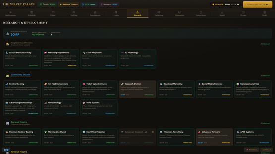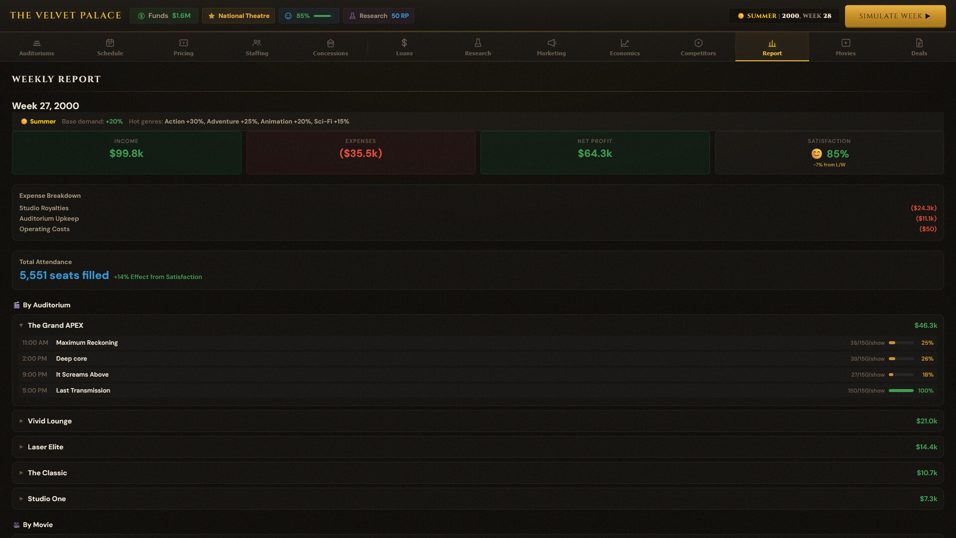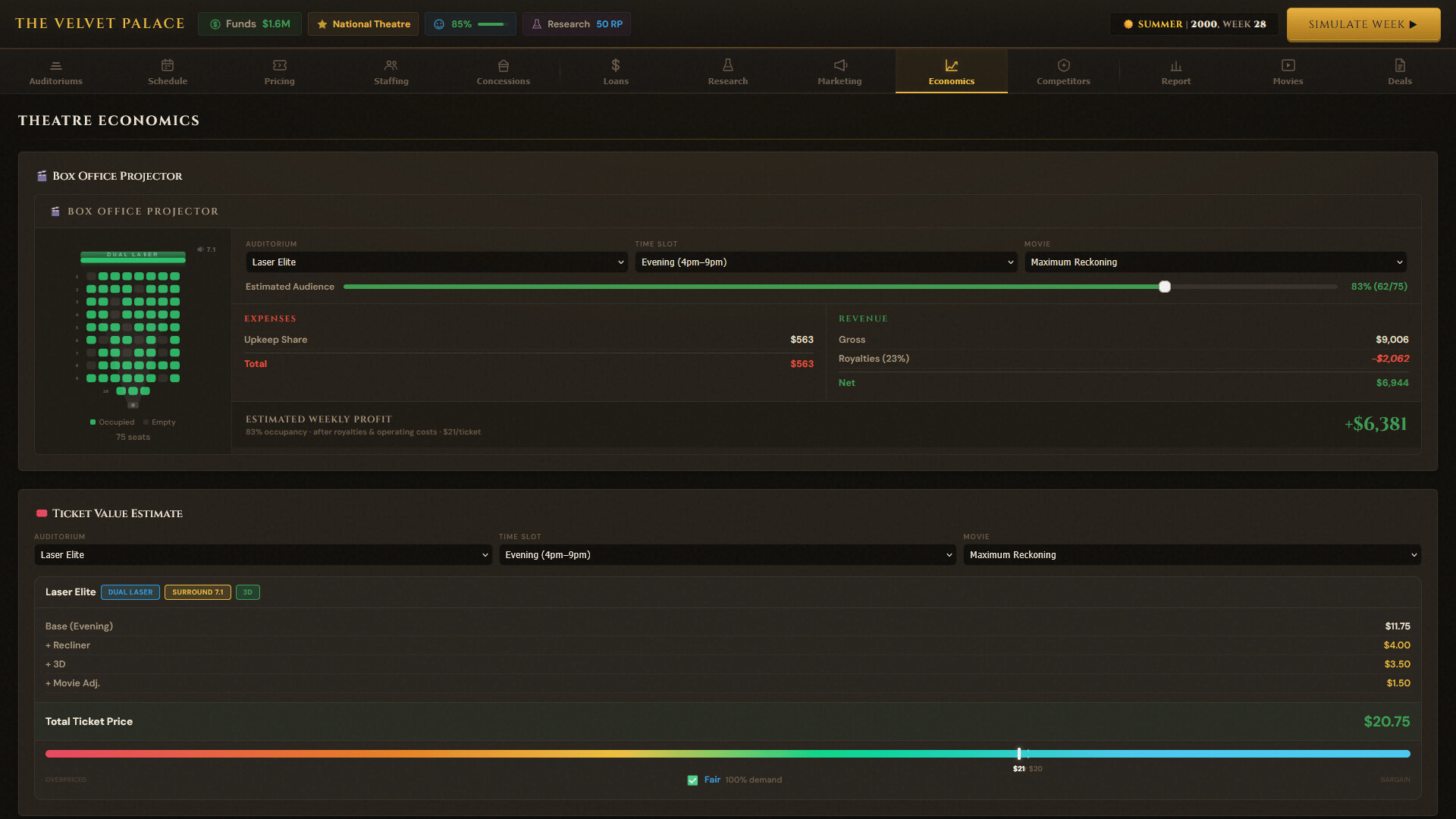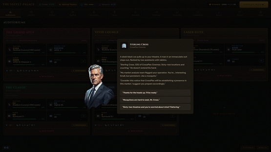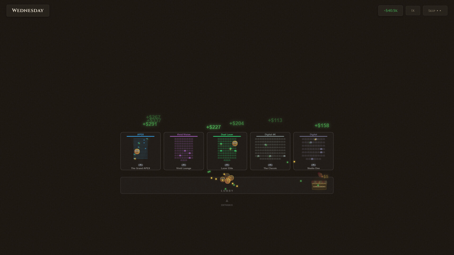 Box Office Mayhem is a business management game where you simulate running your own movie theatre. Navigate through signing movie deals, managing day to day operations, and struggle as movie goers have unpredictable behavior. Play solo against AI competitors or take it online against friends!