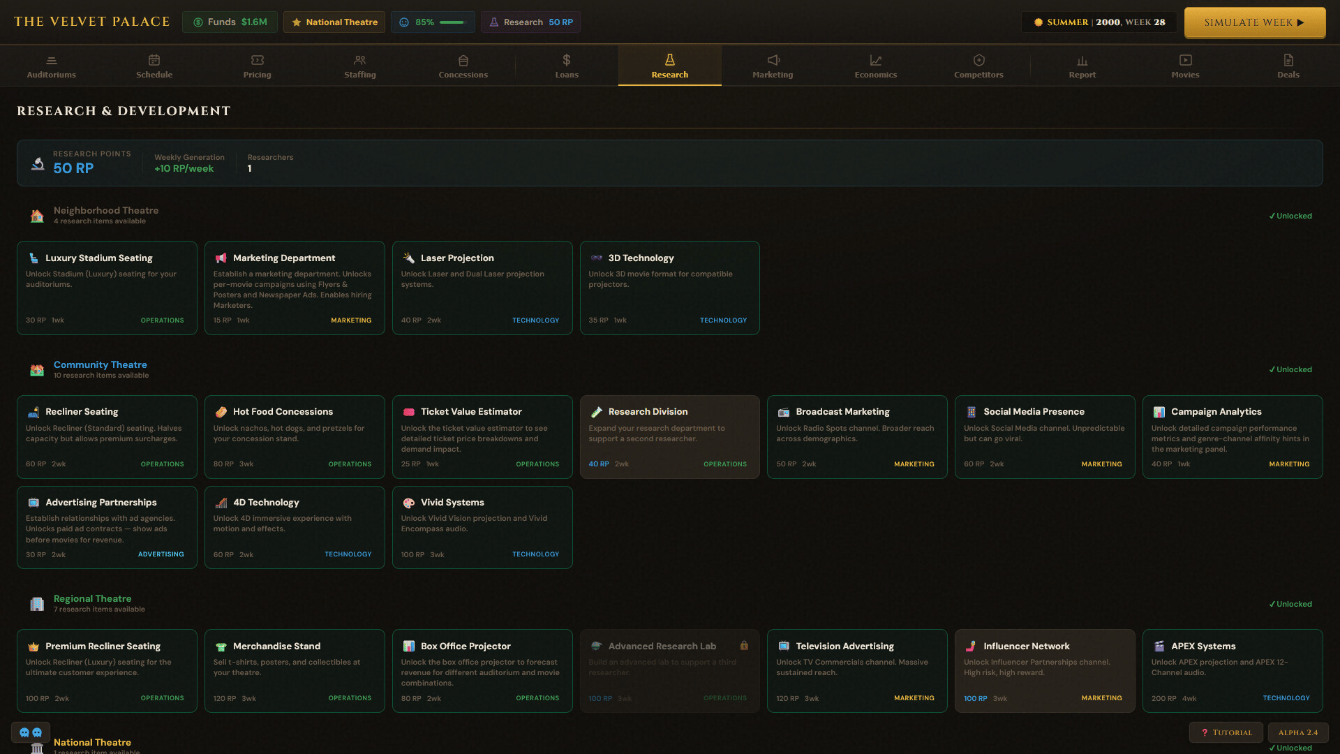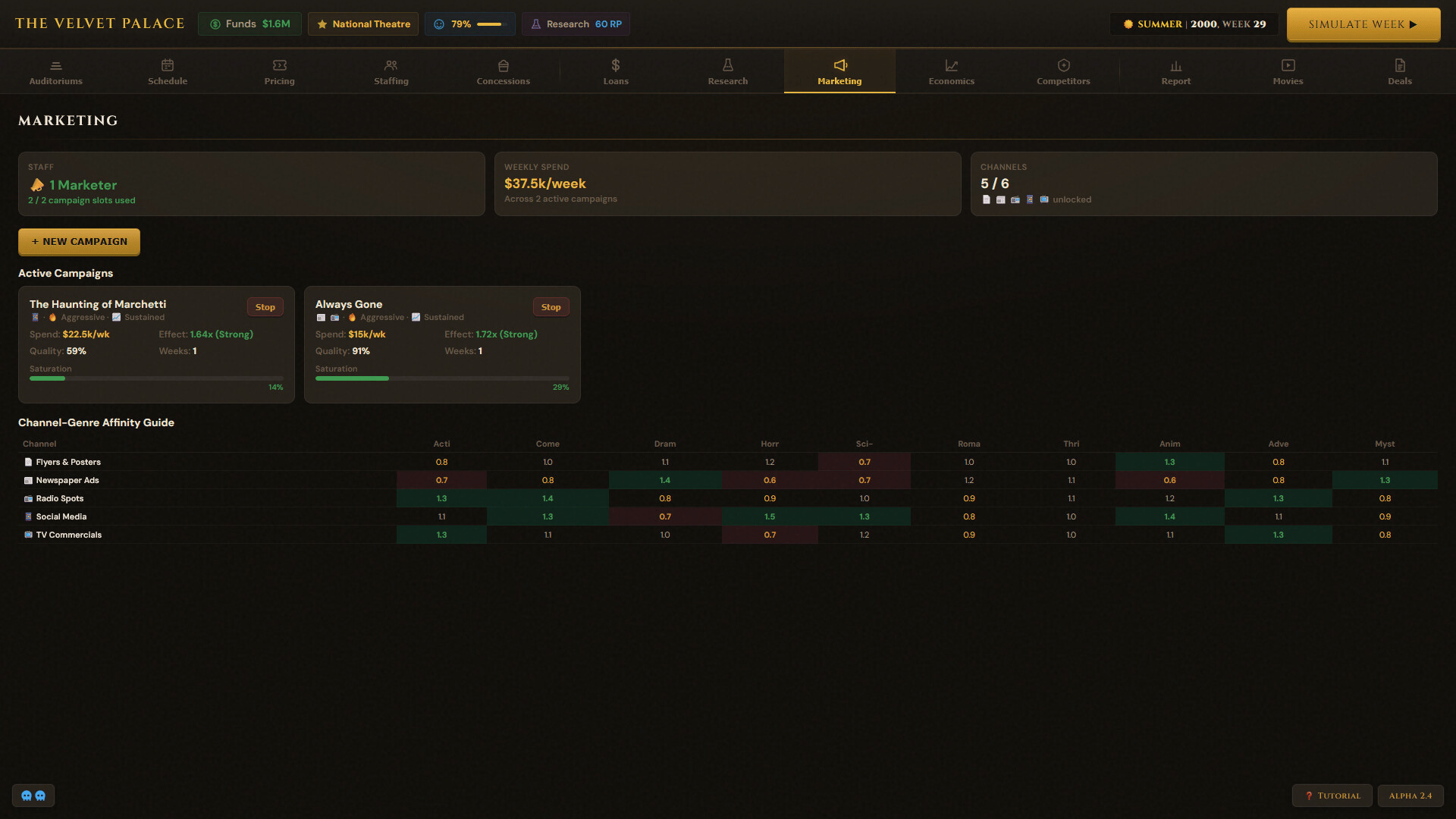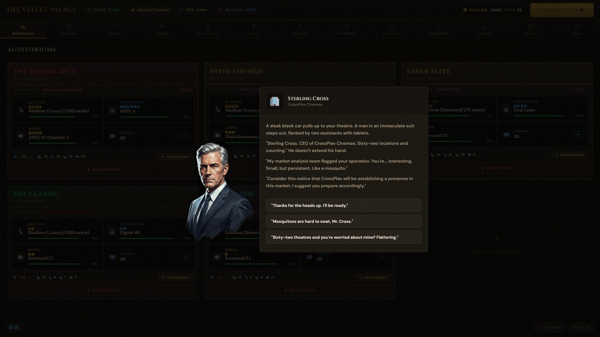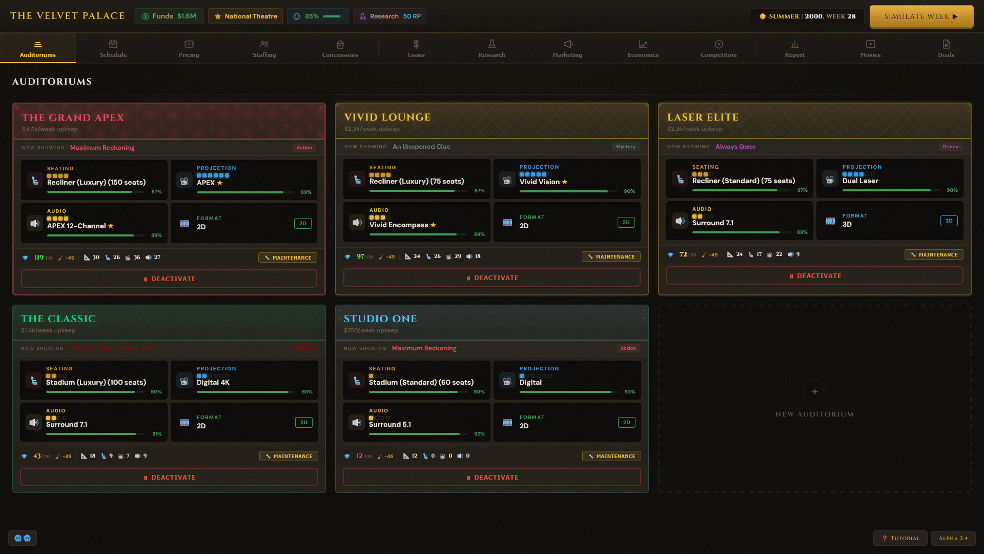 Box Office Mayhem is a business management game where you simulate running your own movie theatre. Navigate through signing movie deals, managing day to day operations, and struggle as movie goers have unpredictable behavior. Play solo against AI competitors or take it online against friends!