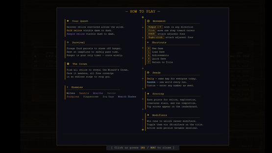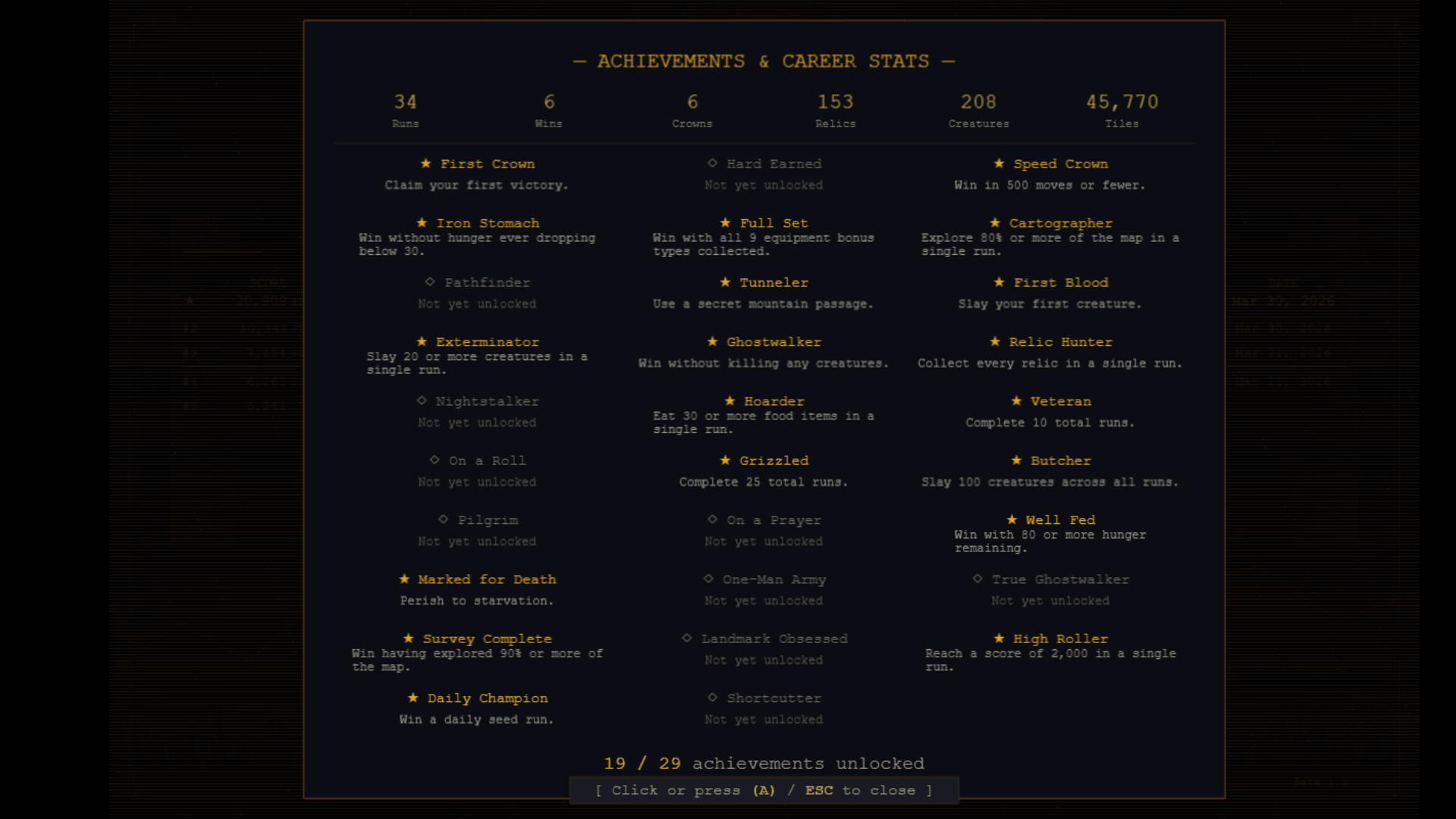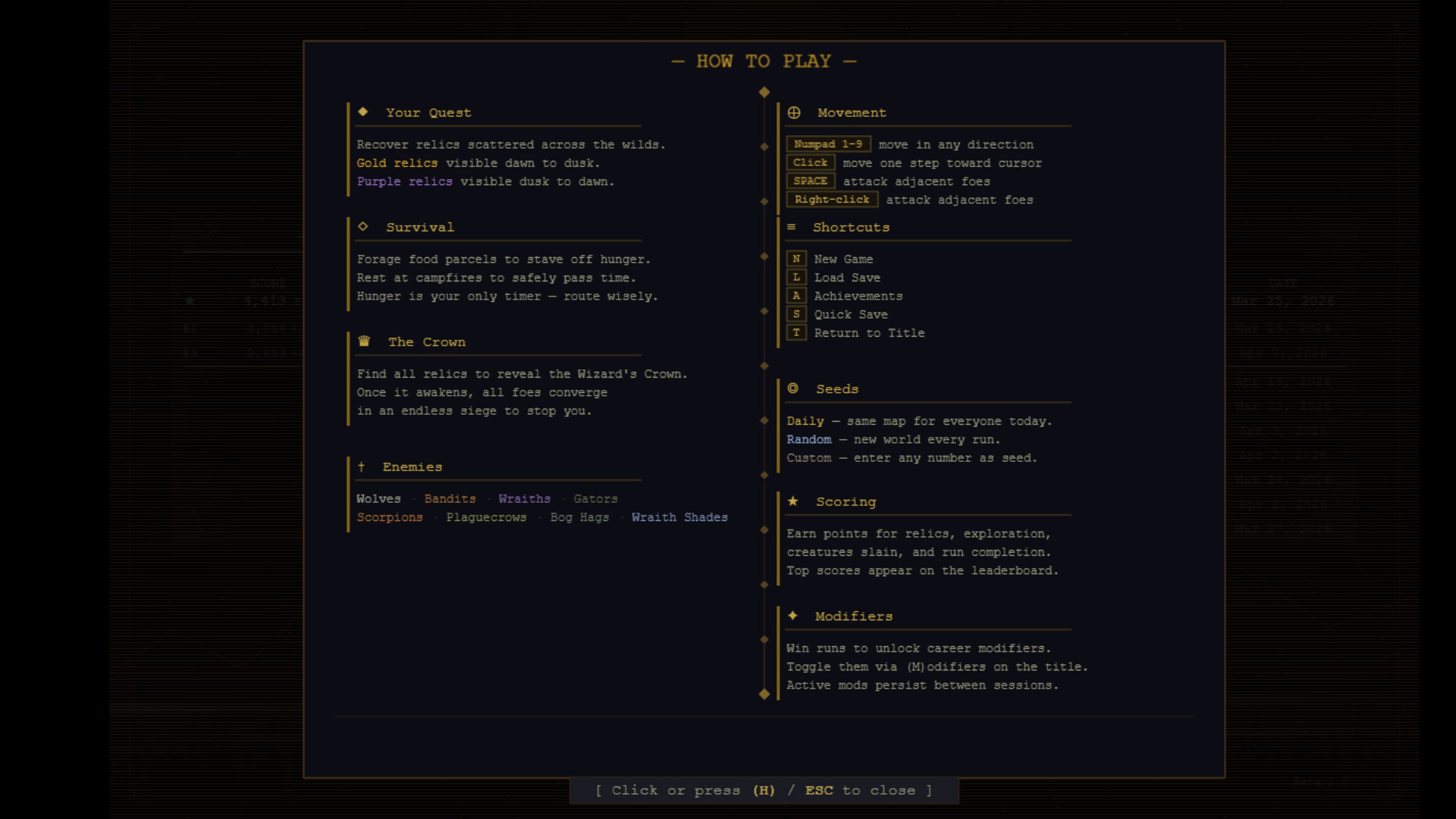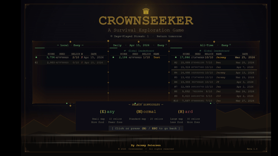 Hunt relics by day and night across a fog-shrouded world. Manage hunger. Gear up. Outlast or defeat what's hunting you. Collect all the relics — and the Crown appears. If you survive long enough to claim it.