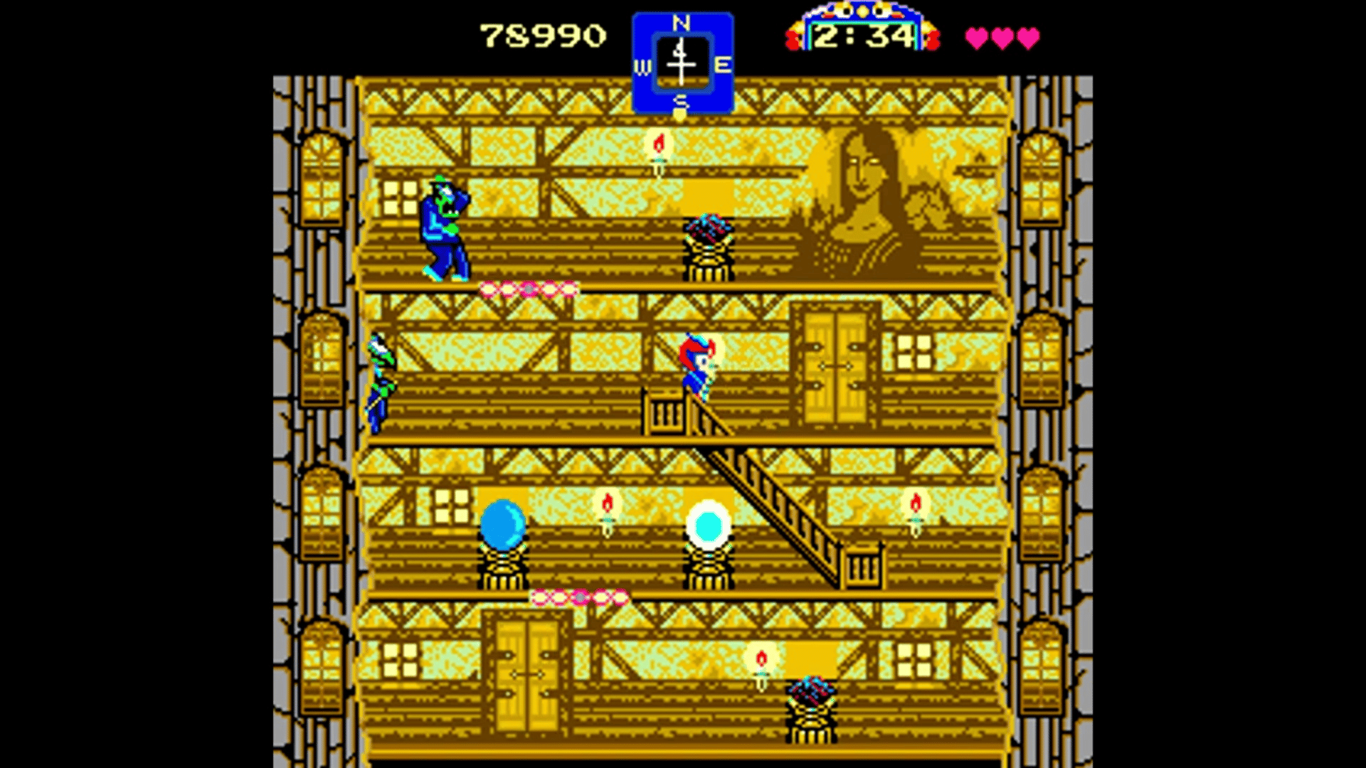 You play as a young ghost hunter boy who runs around a haunted house. Your objective is to destroy with your sword all the crystal balls that are in the house, you must go through all the floors and go through the doors guided by the map at the top of the screen in a time limit without getting caught by the ghosts, frankenstein, witches and other creepy creatures. With the help of your magic glove can freeze ghosts for a short period of time to later hit them with the sword. Once you've destroyed all the crystal balls, the haunted house starts falling apart, and you must run for your life towards the exit to win the stage. You can transform into a super hero, entering through the flashing door to grab special items.