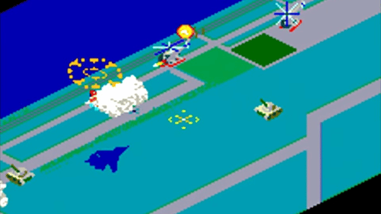 A shooting 'em up game where you pilot an F-15 around various obstacles including missiles, airplanes, helicopters, cities, destroyers, carriers, submarines, tanks, and others while shooting or firing missiles at them.