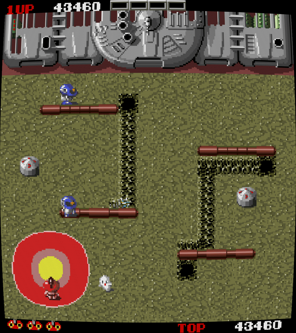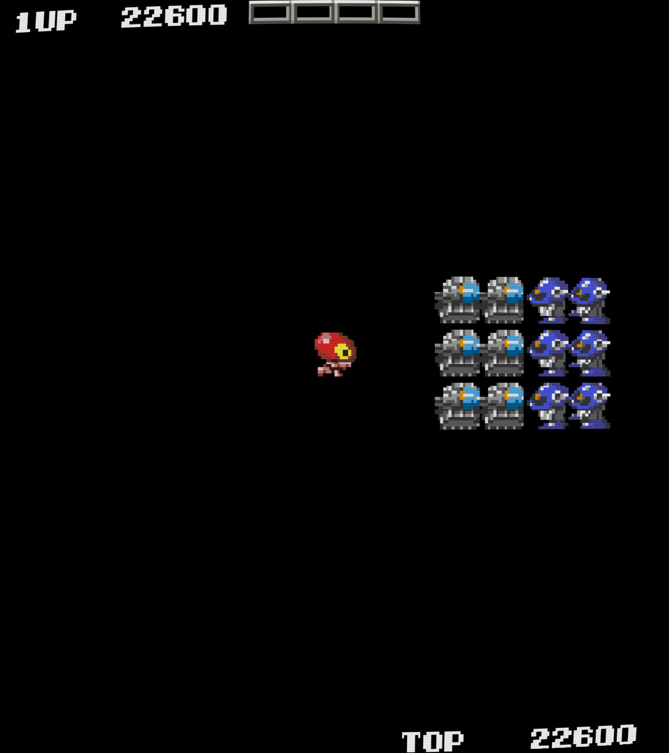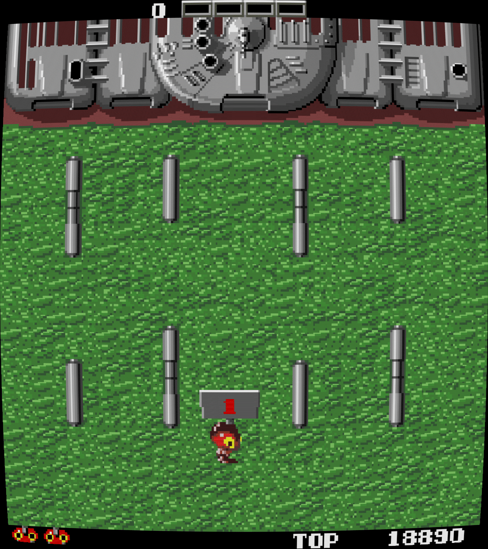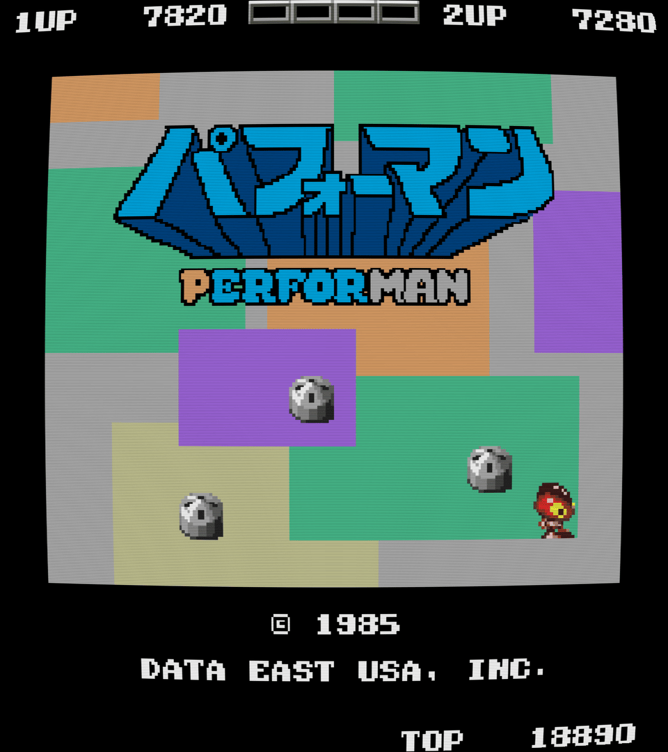 Performan was Toaplan's first shooter, and it's certainly not what one would expect from them, especially when looking at some of their later games. It's actually a strange, overhead shooter much like Robotron. The star is the titular Performan, a native in a jungle that wears a huge mask, who's being stalked by a squadron of drill-wielding robots. He must stop them using balls of energy, his ability to dig underground, and bombs that are set up in every level. He can also go into Power Mode by shooting ghosts that randomly appear, which turns him green and invincible for a short time. Needless to say, Performan is a very weird, very hard game. There are 99 levels and the game loops endlessly, as typical of most early arcade games. The main problem with Performan is that he's far too weak to survive for long. He can't move quickly, his shots are slow, and he can only have one shot on screen at a time, which can easily be dodged. The bombs are an easy way to get rid of two or maybe three at a time, but this usually requires setup, which takes a bit time, and by which point you're like to be killed.