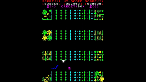 A maze game where the player guides a car through a maze-like forest collecting coins while avoiding an enemy cars and snakes.