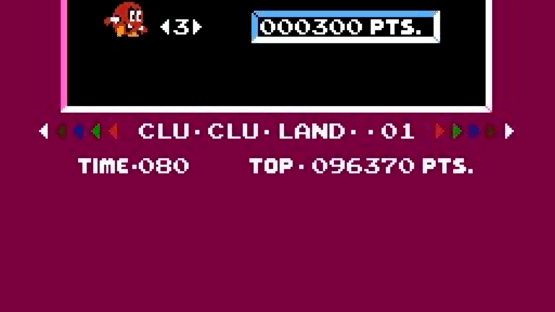 Vs. Clu Clu Land is the Nintendo Vs. System (Arcade) port of Clu Clu Land (NES). In the game, two fish must swim through a maze attempting to reveal hidden gold bars while fighting against sea urchins. The game has multiplayer support for 2 simultaneous players.